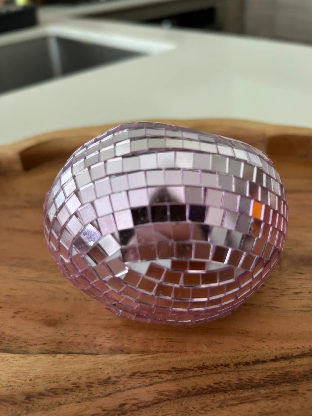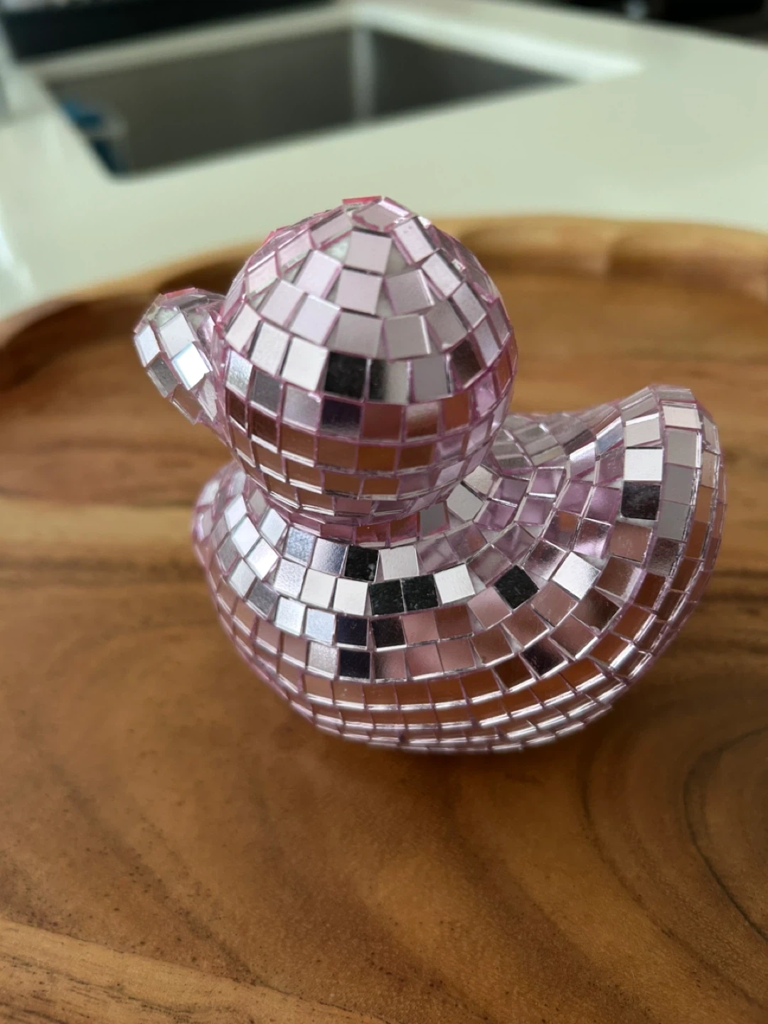 Selling a cute disco duck decor item! It's in great condition and would look great on a shelf or desk. It's covered in tiny pink mirror squares, giving it a fun disco ball effect