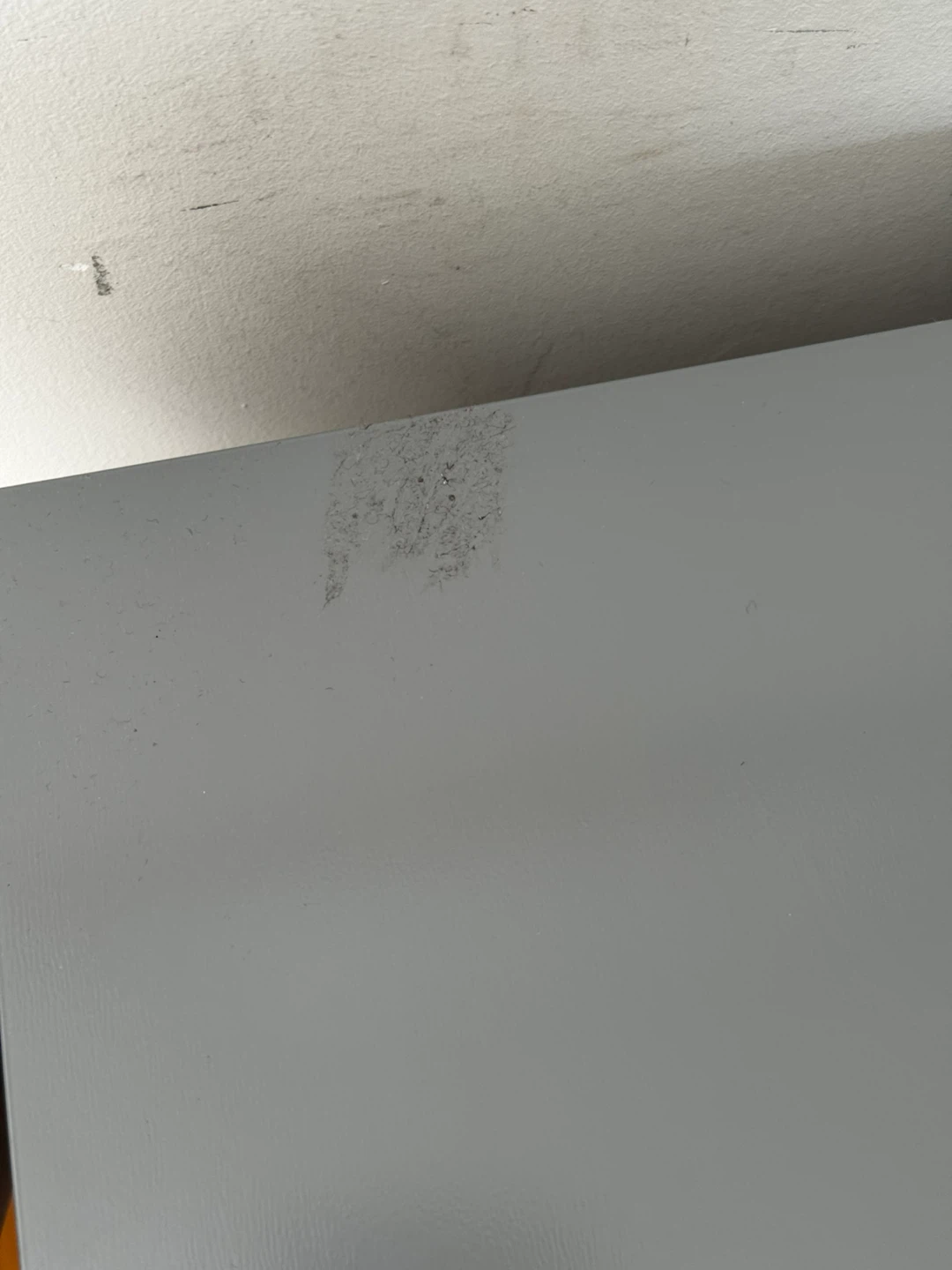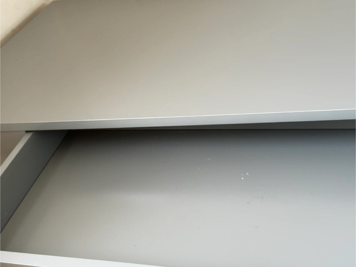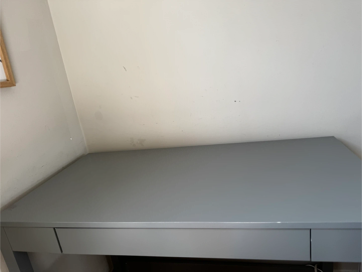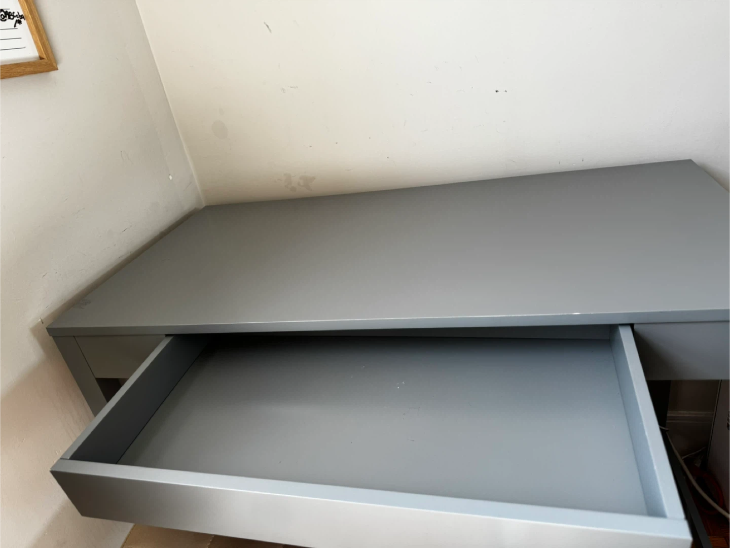 Selling a desk that's in good condition! It's a grey colour and measures 39 inches wide, 19.75 inches deep, and 30 inches tall. Perfect for a home office or study space