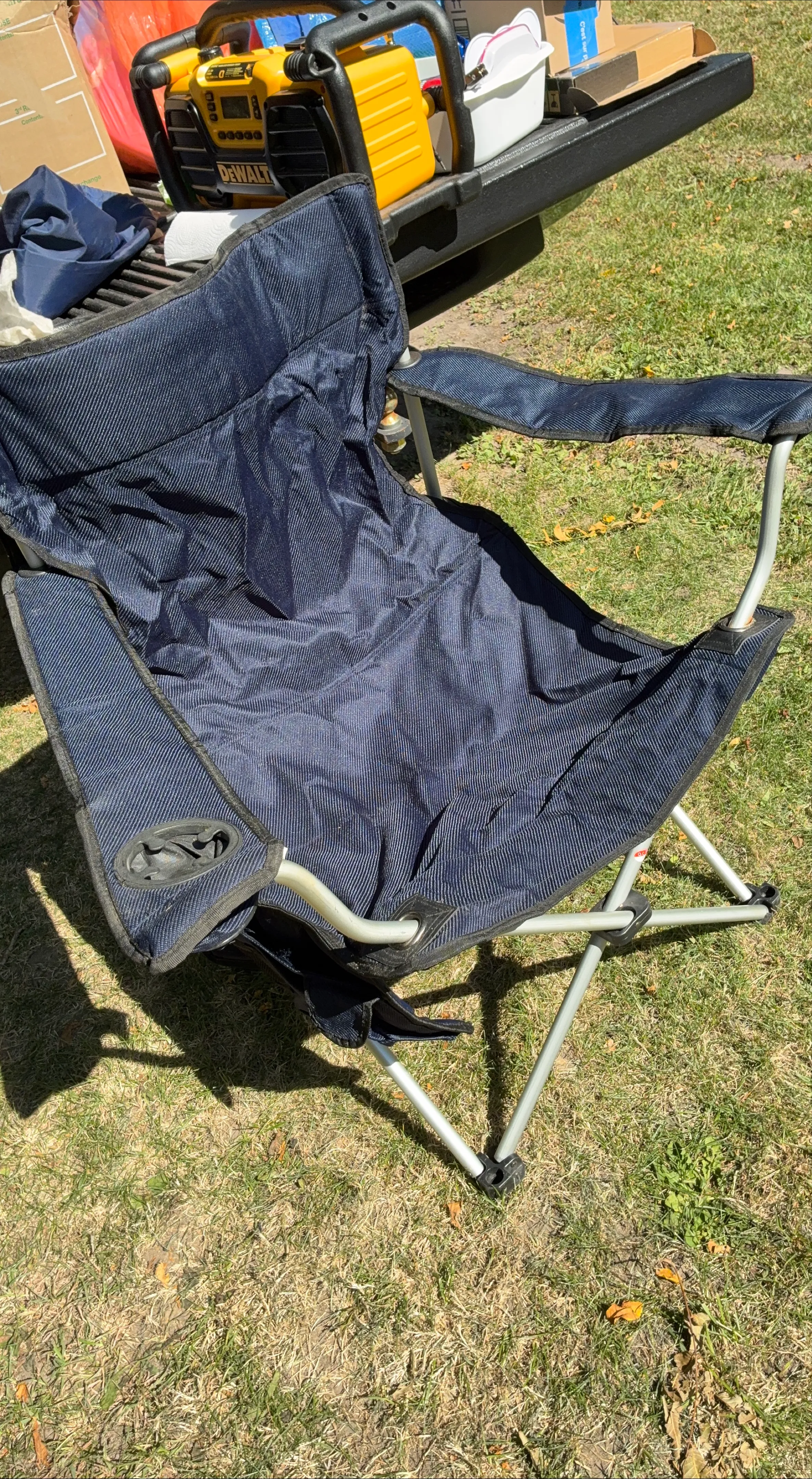 Selling a folding camp chair in blue. It's in great shape and perfect for camping, picnics, or just relaxing in the backyard! Has a convenient cup holder too as well as a carrying bag.