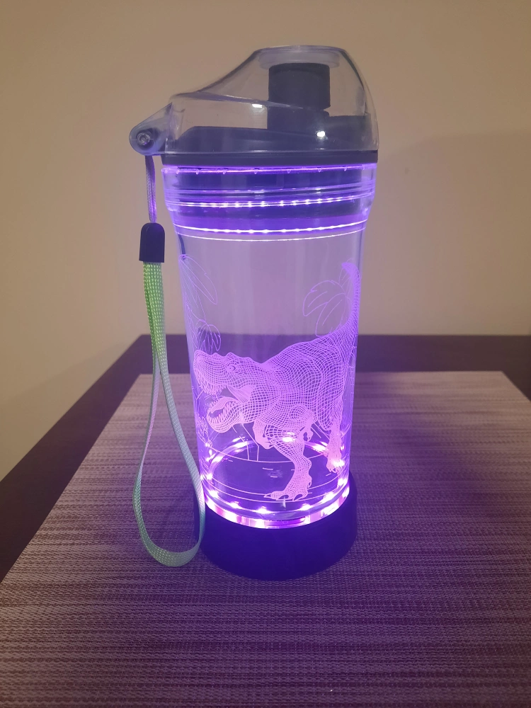 140Cool dinosaur themed water bottle with LED lights! Perfect for kids who love dinosaurs and need a fun way to stay hydrated. The bottle features a T-Rex design and a convenient carrying strap. 6 DIFFERENT colors