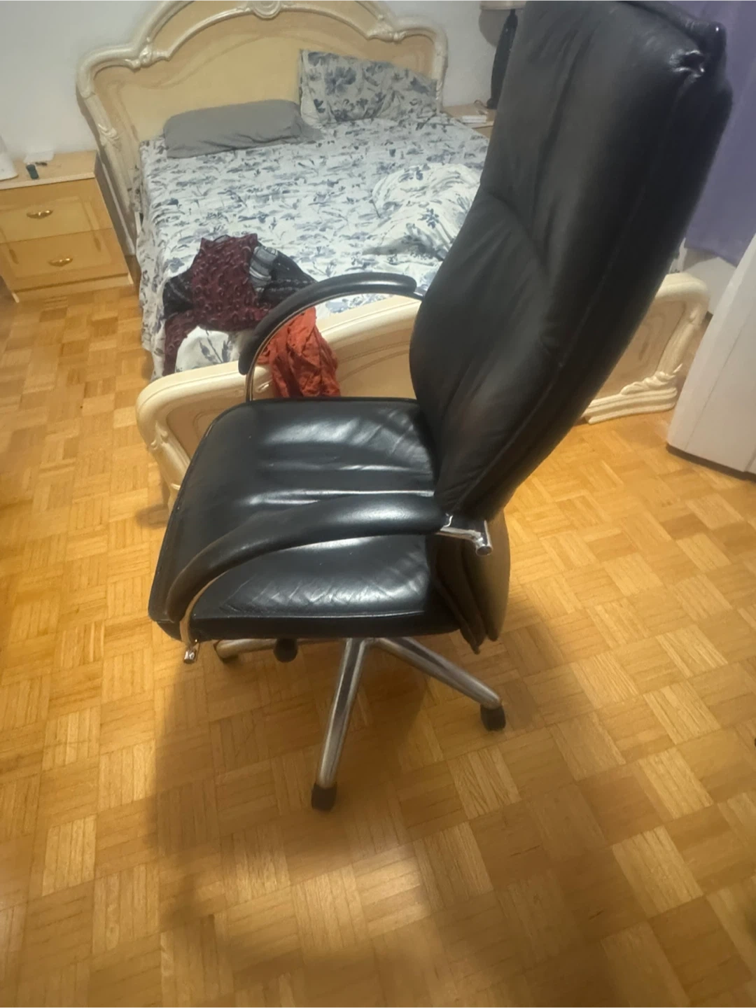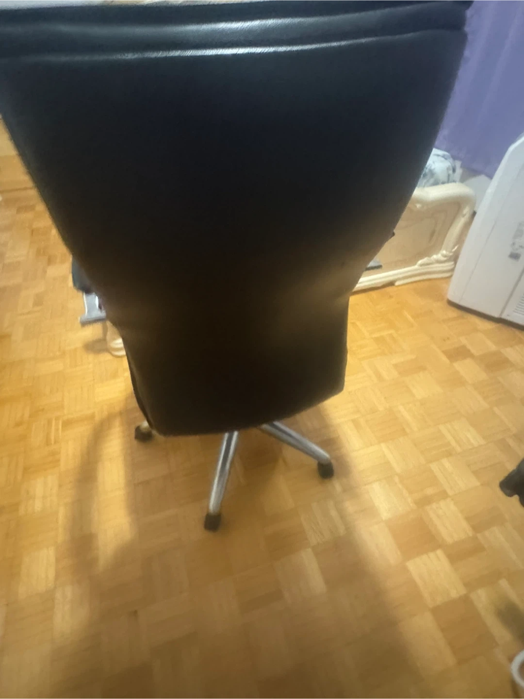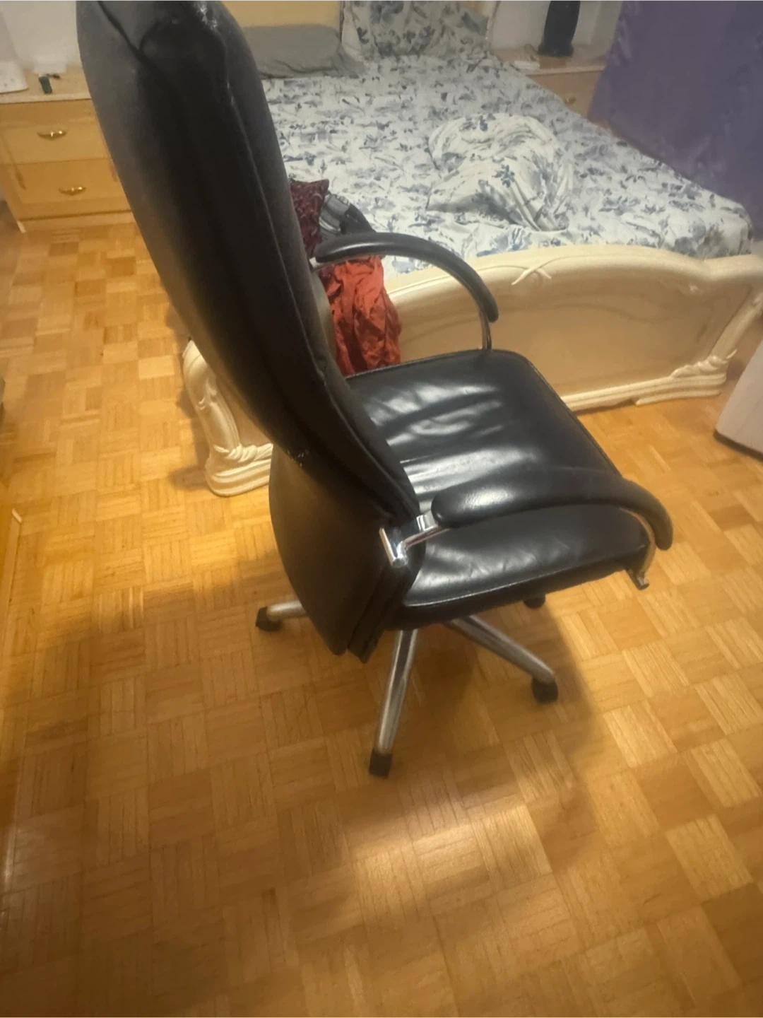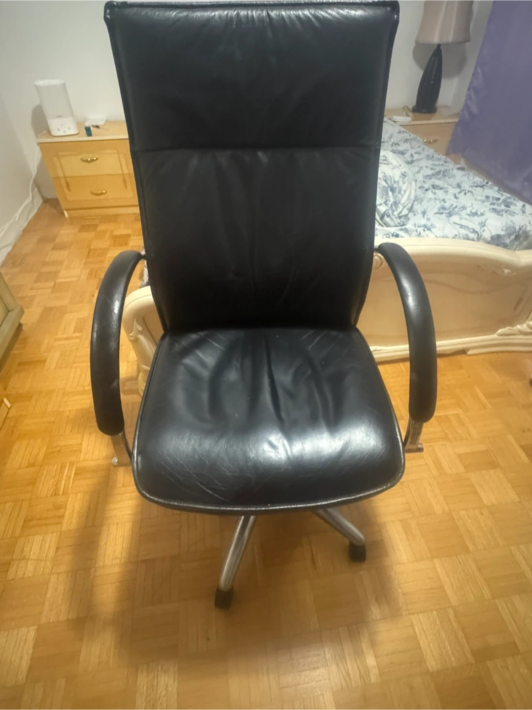 21Selling a comfortable black leather office chair. It features a high back and armrests for support, along with a wheeled base for easy movement around your workspace. Great for a home office or study area!