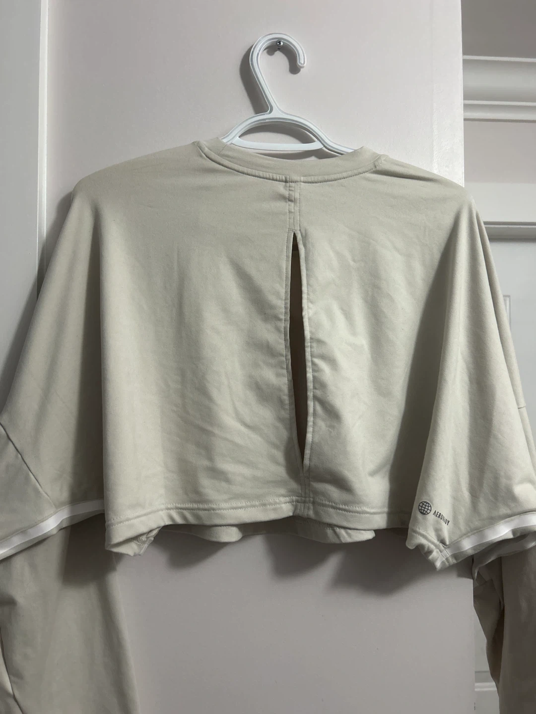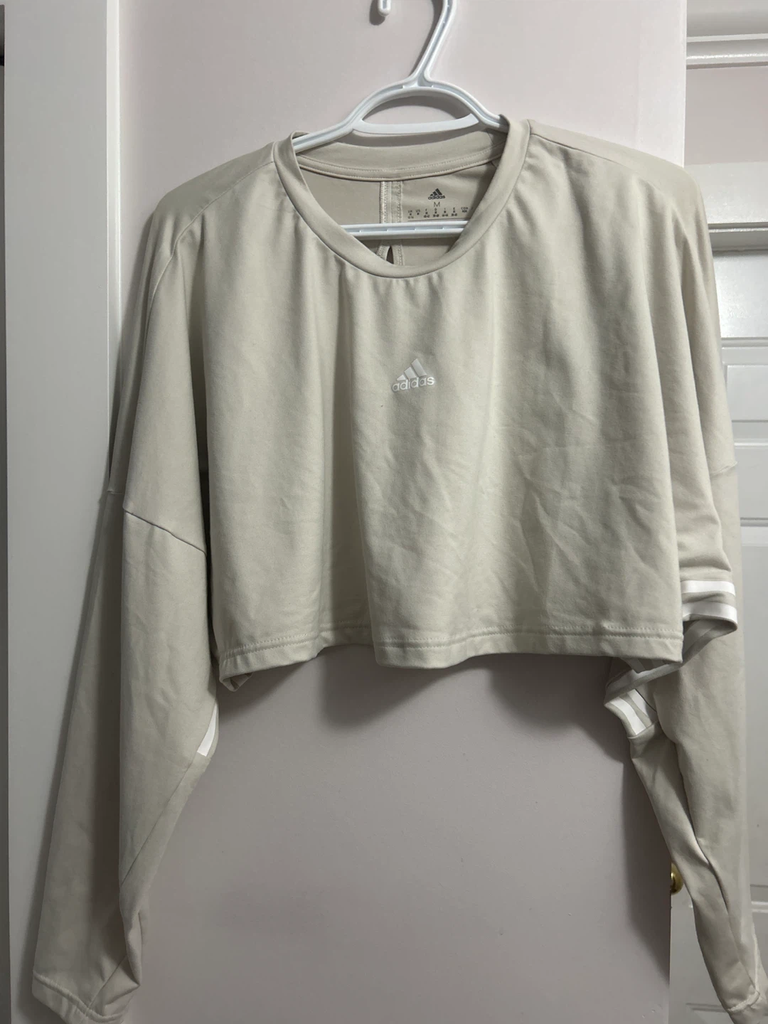 Selling an Adidas cropped long sleeve top in size medium! It's a light beige colour with the Adidas logo on the front and stripes on the sleeves. Great for workouts or casual wear!