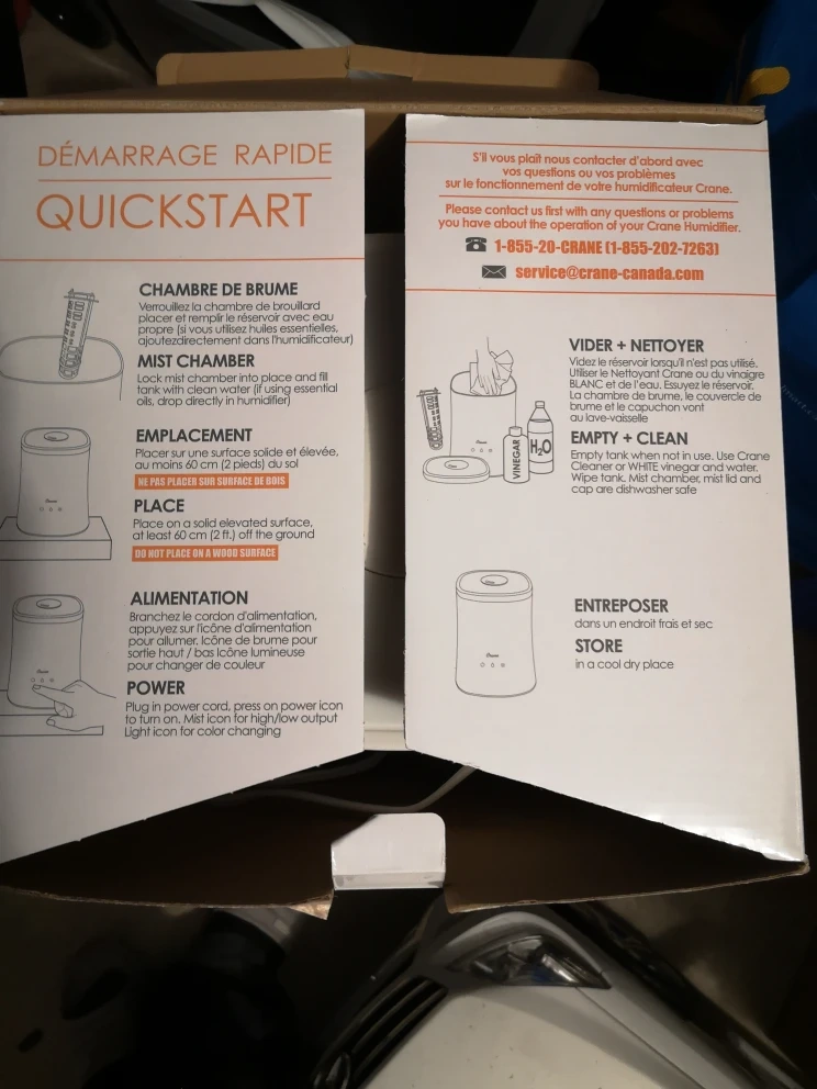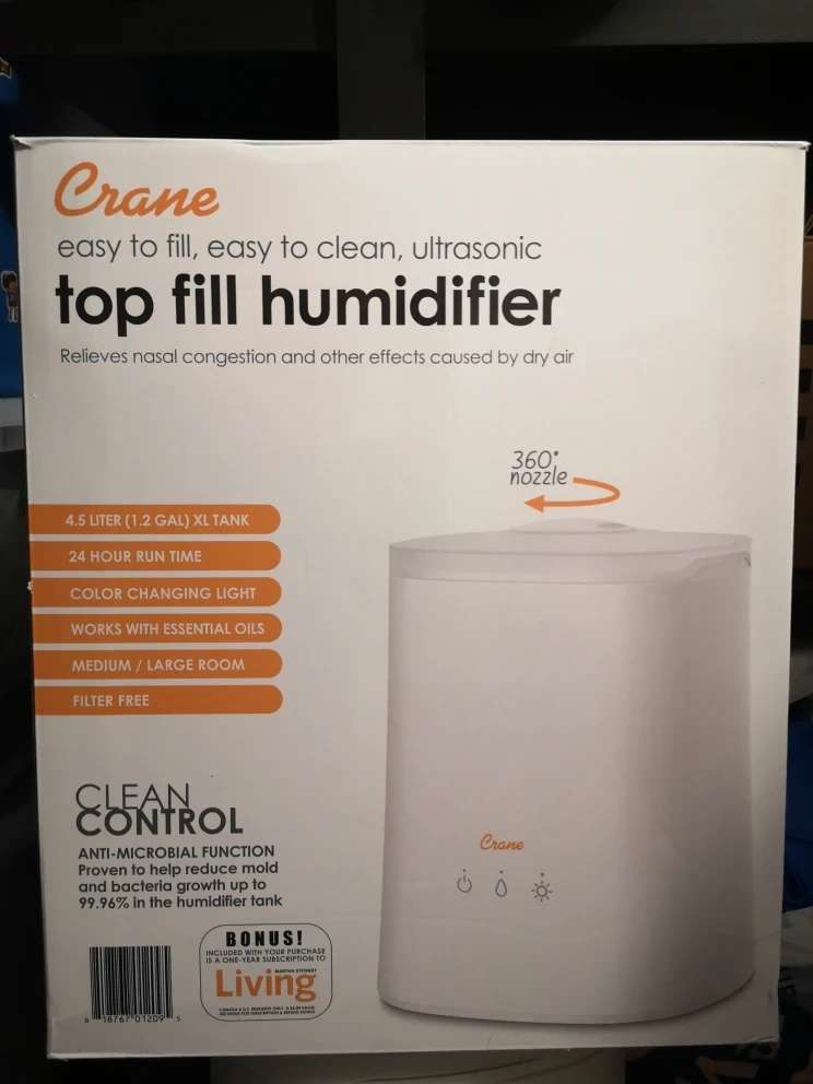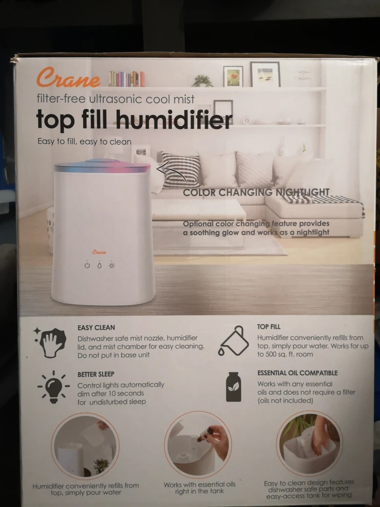 I'm selling a Crane top fill ultrasonic cool mist humidifier! It's easy to fill and clean, and it features a colour-changing nightlight. It has a 4.5 liter (1.2 gal) XL tank and runs for 24 hours. It's also compatible with essential oils and works in medium to large rooms. The humidifier is filter-free and has clean control with an anti-microbial function to help reduce mold and bacteria growth in the humidifier tank