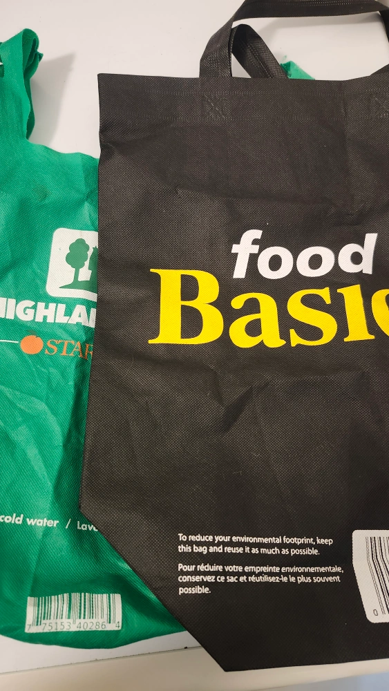 Two reusable grocery bags for sale! One is from Food Basics and the other is from Highland Farms. Great for reducing your environmental footprint