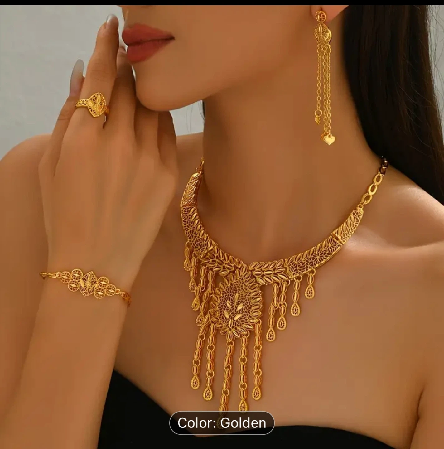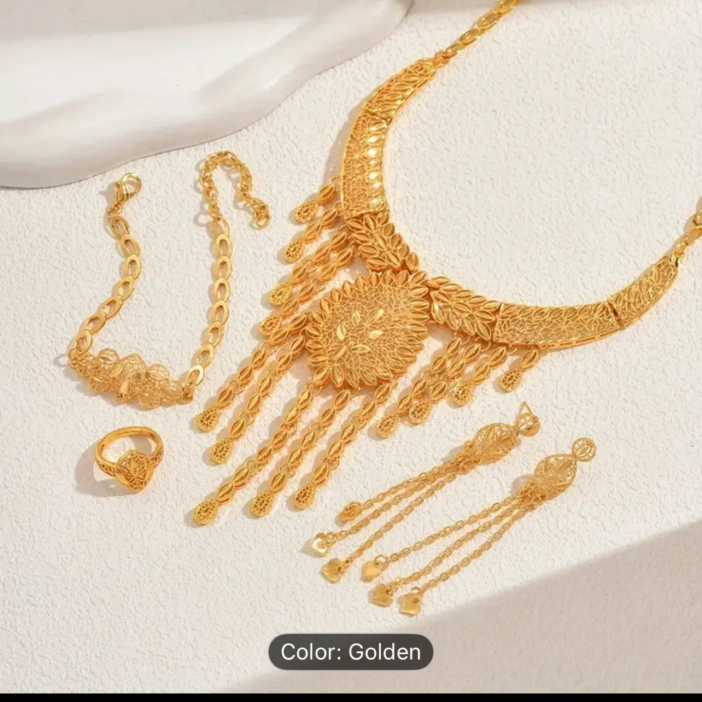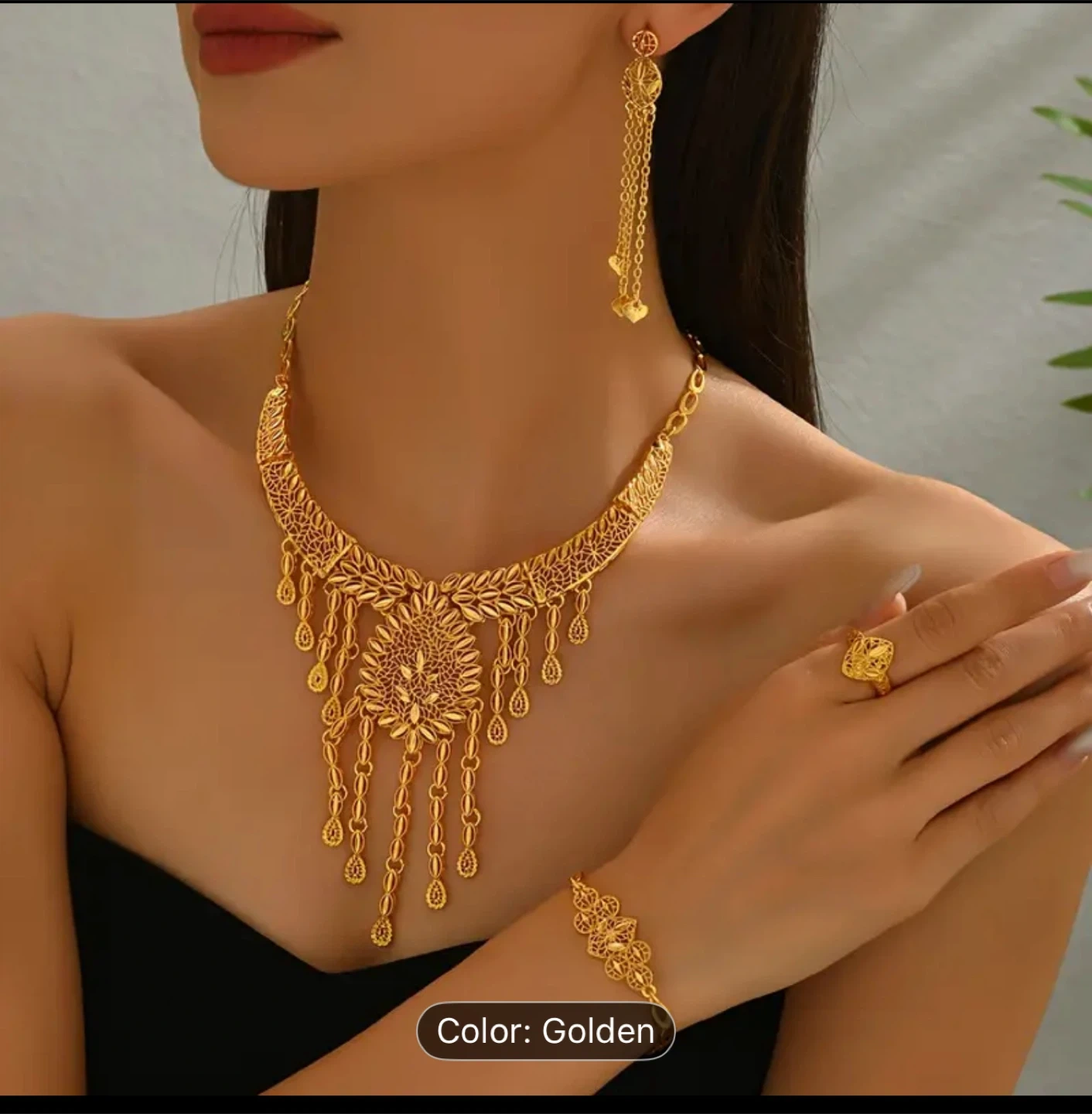 Beautiful golden colour jewelry set including a necklace, bracelet, ring, and earrings. Perfect for adding a touch of elegance to any outfit!