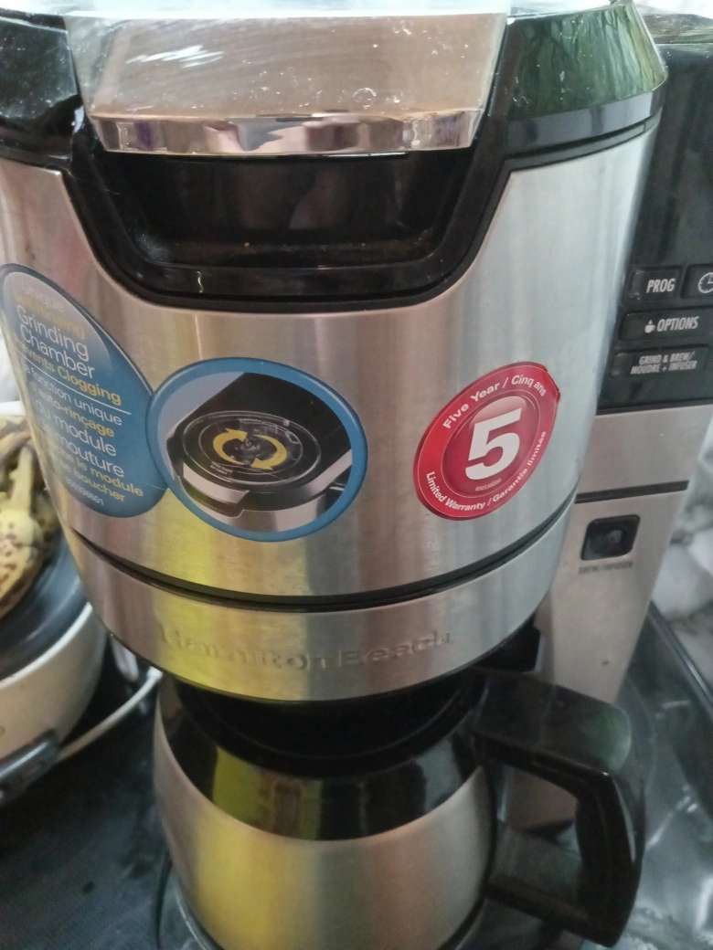 Hamilton Beach coffee maker in good condition! It features a grinding chamber and a 5 year limited warranty