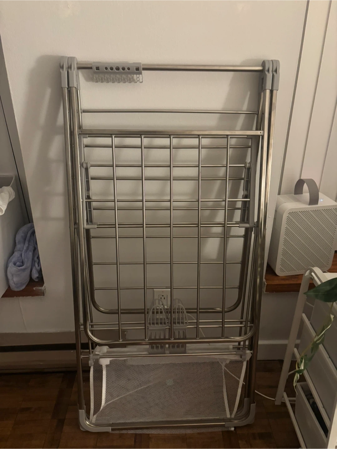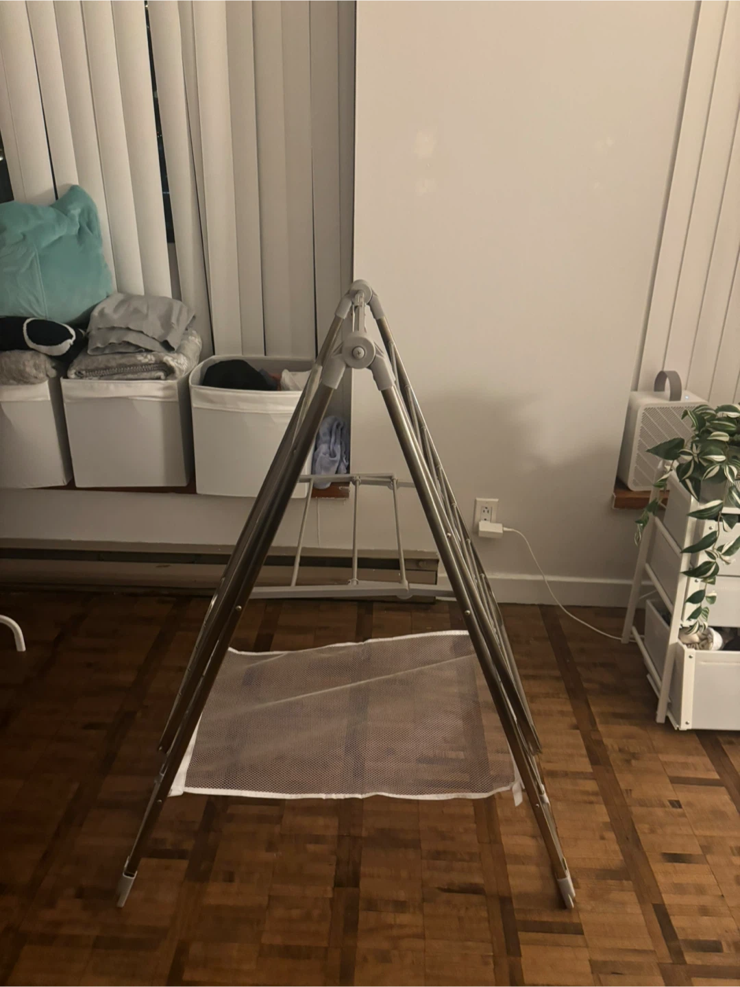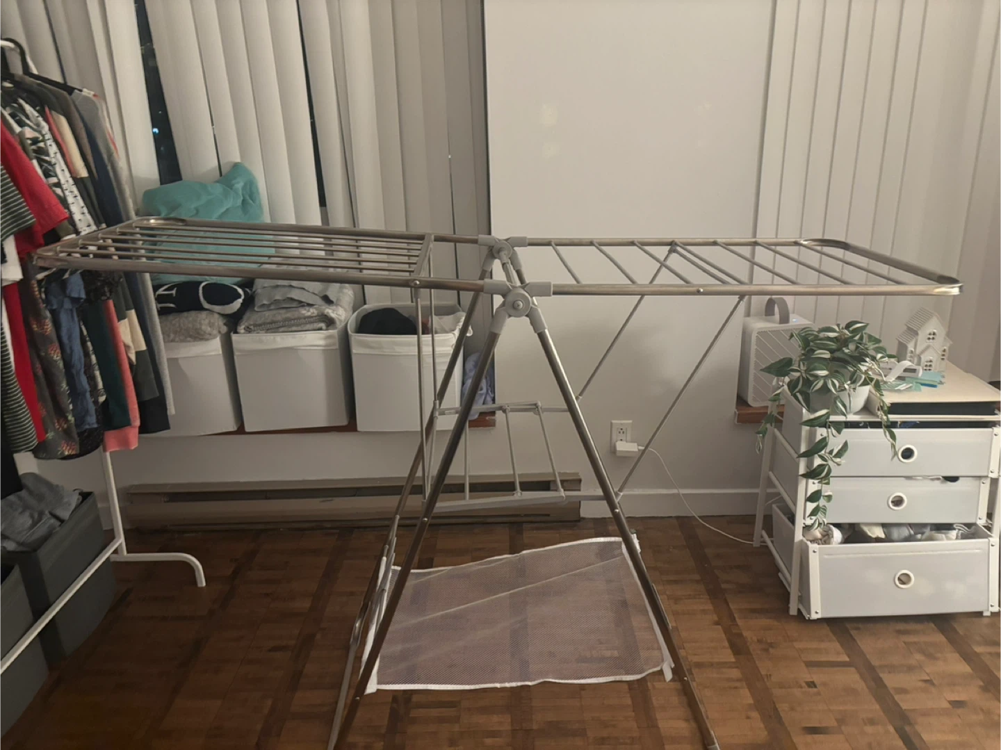 Selling a foldable clothes drying rack. It's in great condition and super handy for small spaces! It folds up easily for storage when not in use
