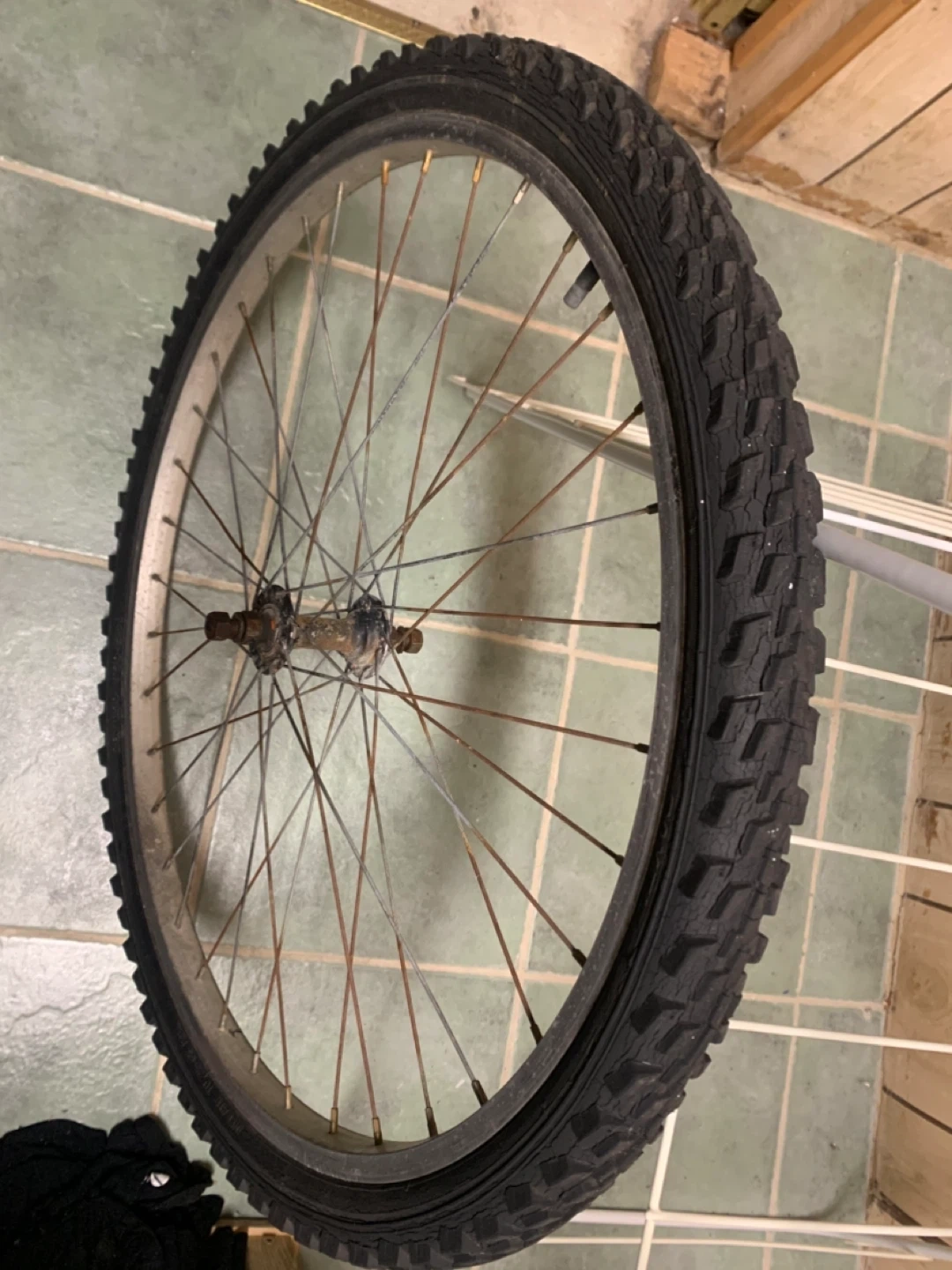 Give away one front wheel only. 26” mountain bike front wheel (rim n tire). Tire hold air. Good condition n will fit most 26” adult bike.