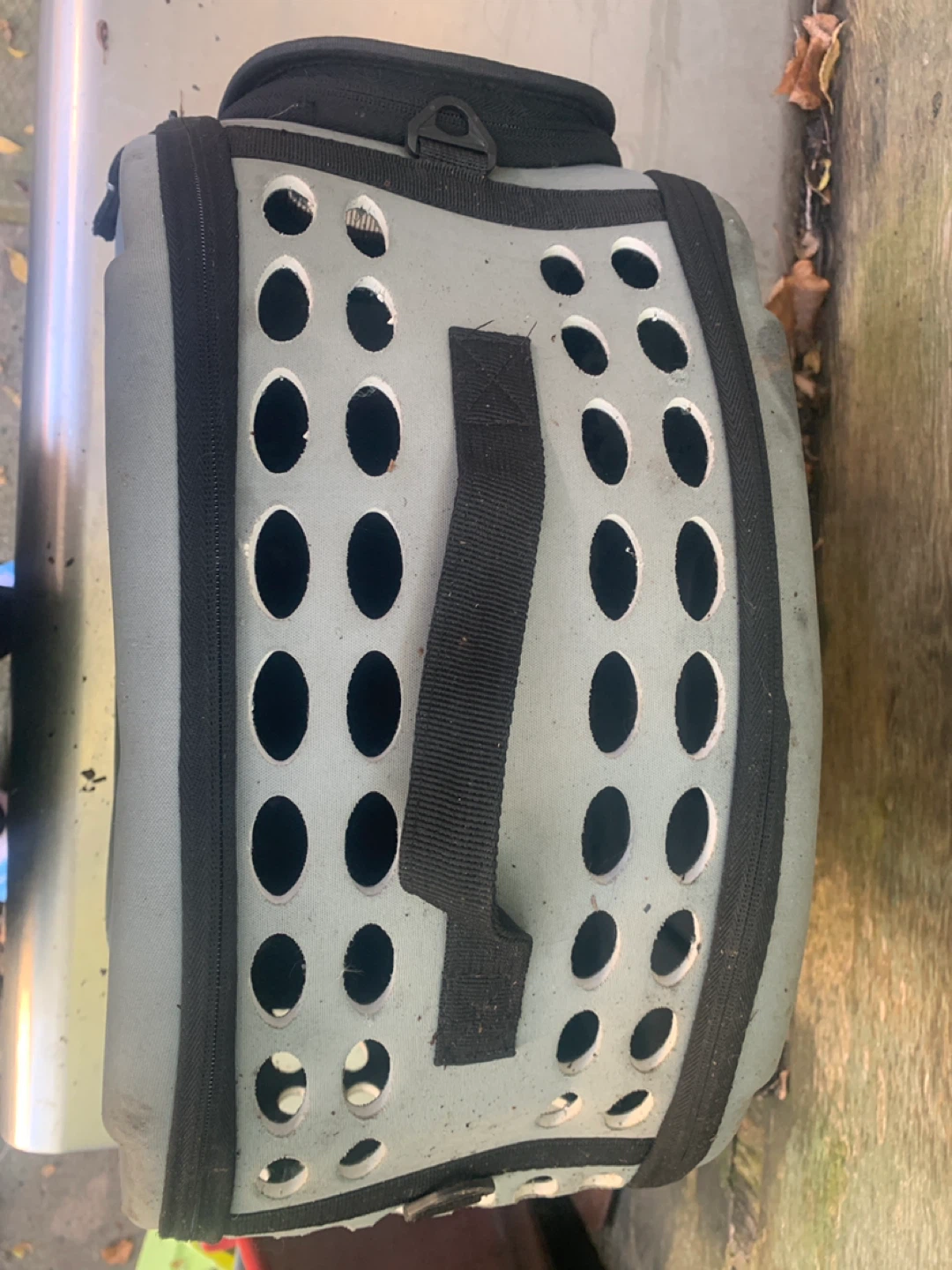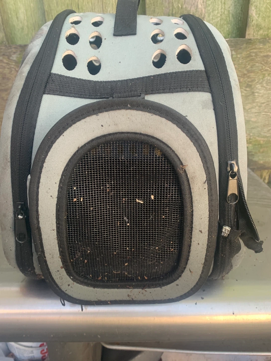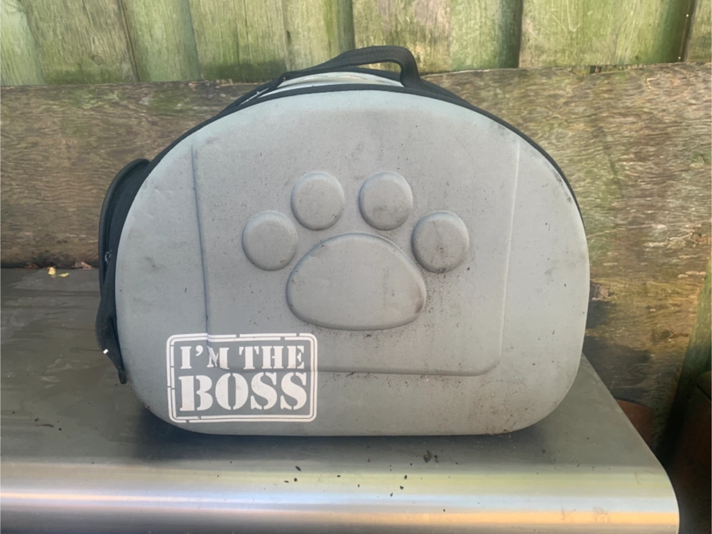 Selling a used grey pet carrier with a cute 'I'm the Boss' sticker! It has a zippered mesh front and plenty of ventilation holes on the sides. Perfect for small dogs or cats. It's a bit dusty but still in good shape for transporting your furry friend