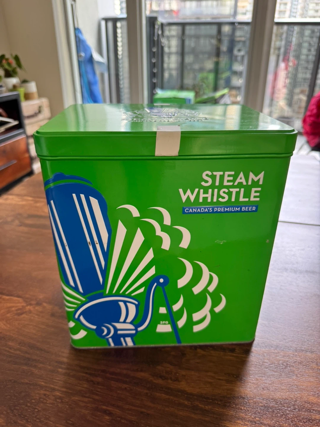 Selling a Steam Whistle Canada's Premium Beer storage tin. It is green with the Steam Whistle logo on the side. Perfect for storing items or as a decorative piece!