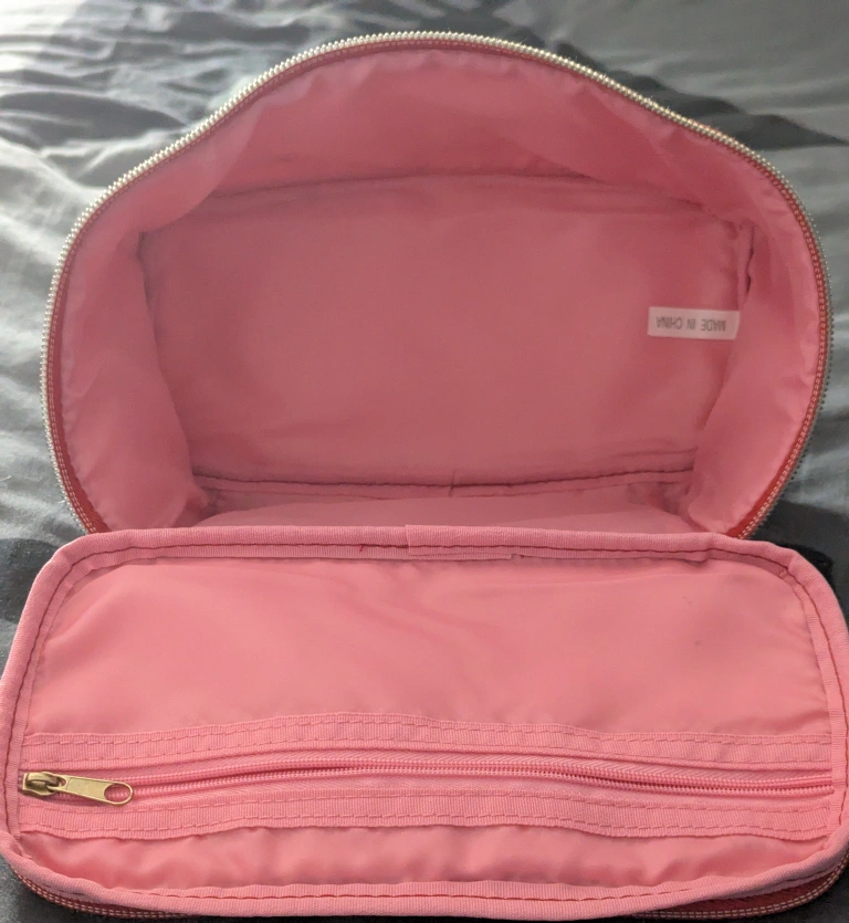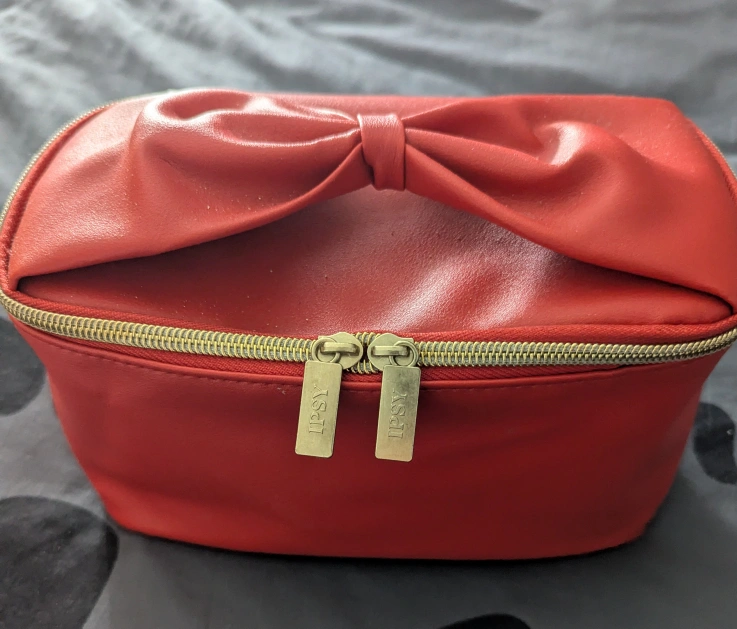 This is a red Ipsy makeup bag. It has a bow on top and a zipper closure. The inside is pink and has a small zippered compartment. Gently used once.