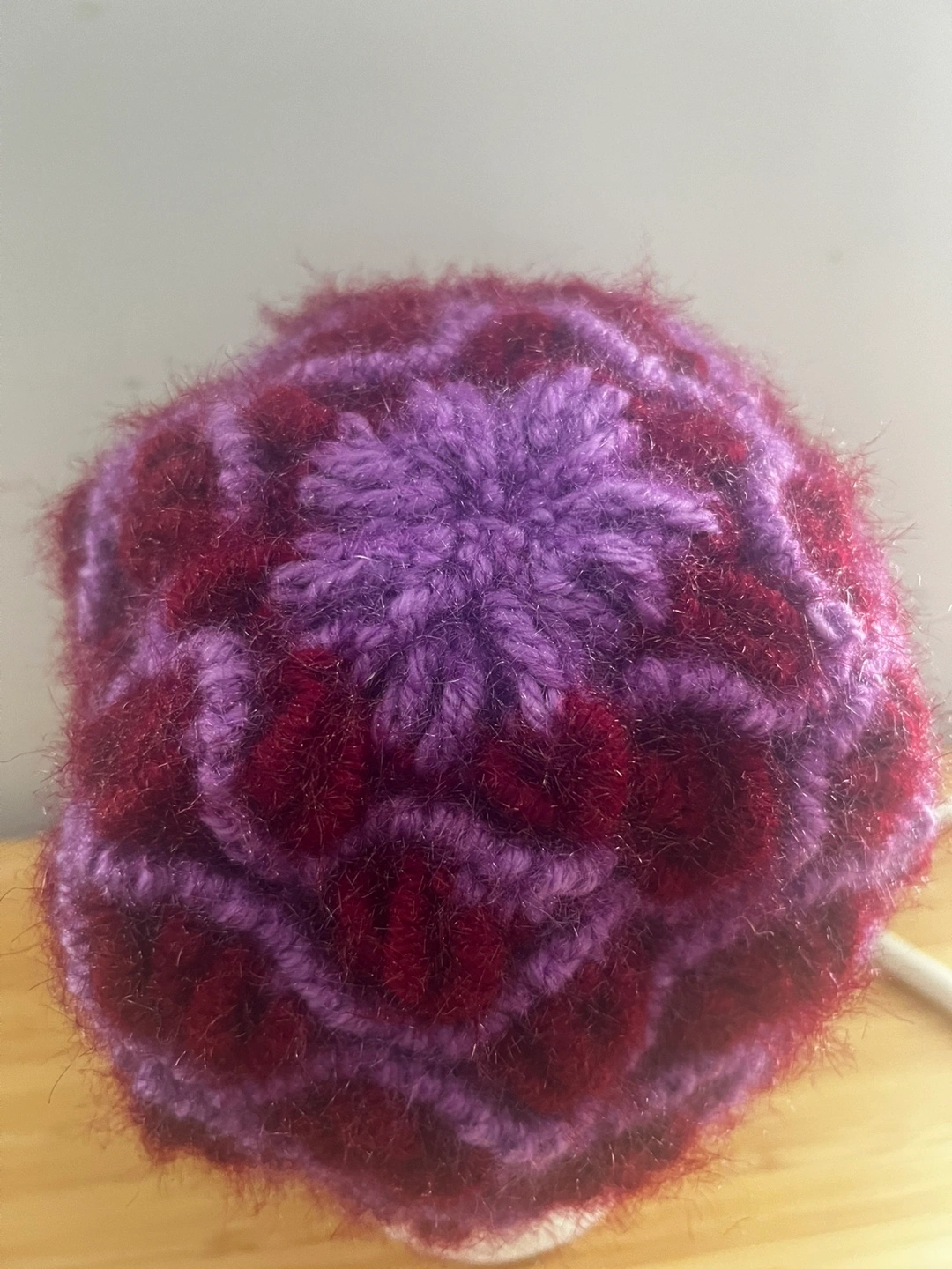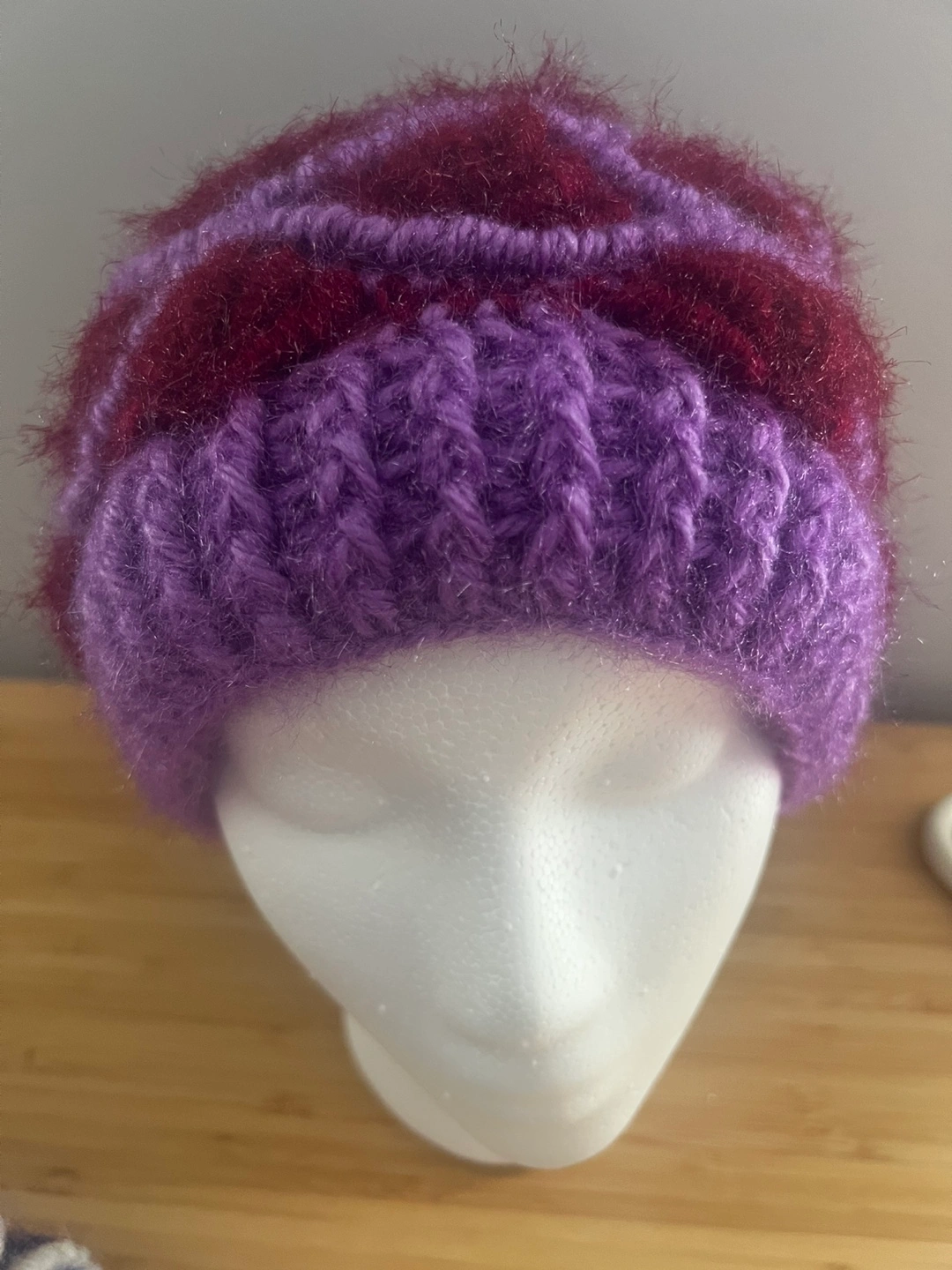 60Cozy up with this unique, handmade knitted beanie! It features a beautiful blend of purple and burgundy colours in a soft, textured knit. Perfect for adding a pop of colour and warmth to your winter wardrobe
