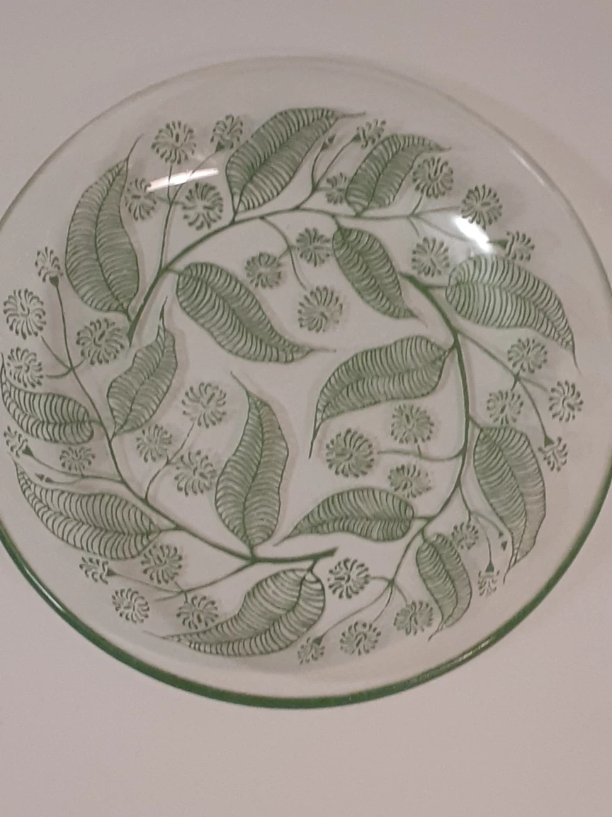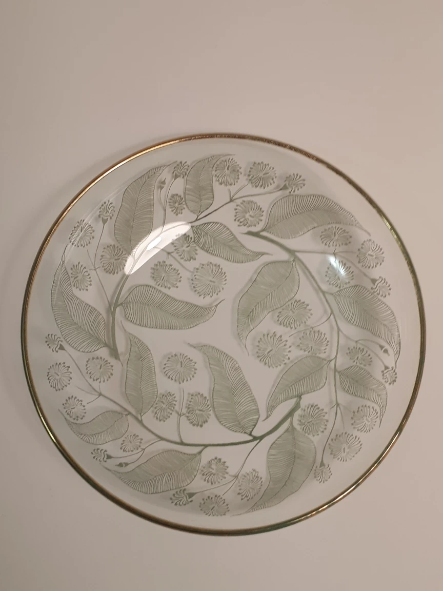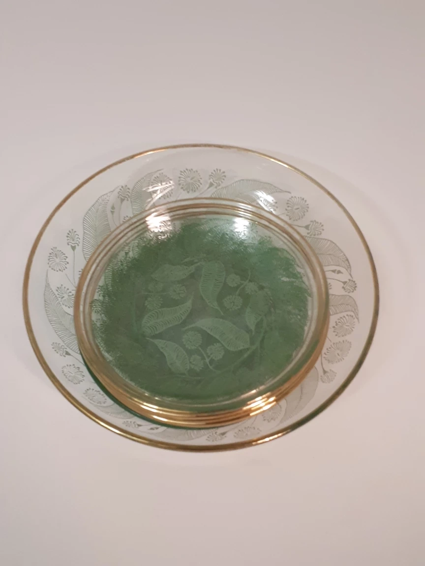 Selling a set of seven glass plates featuring a intricate leaf design and a gold trim around the edges. The set includes one larger plate (14 cm diameter and approximately 3 cm deep) and 6 smaller ones (10 cm diameter and 2 cm deep). Perfect for serving desserts, sauces, aperitifs or snacks with drinks.