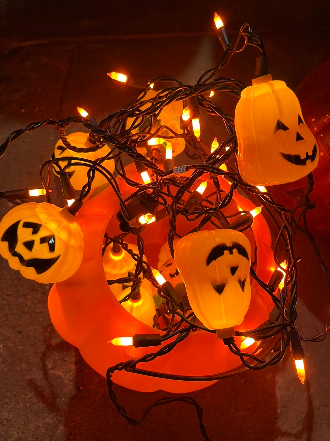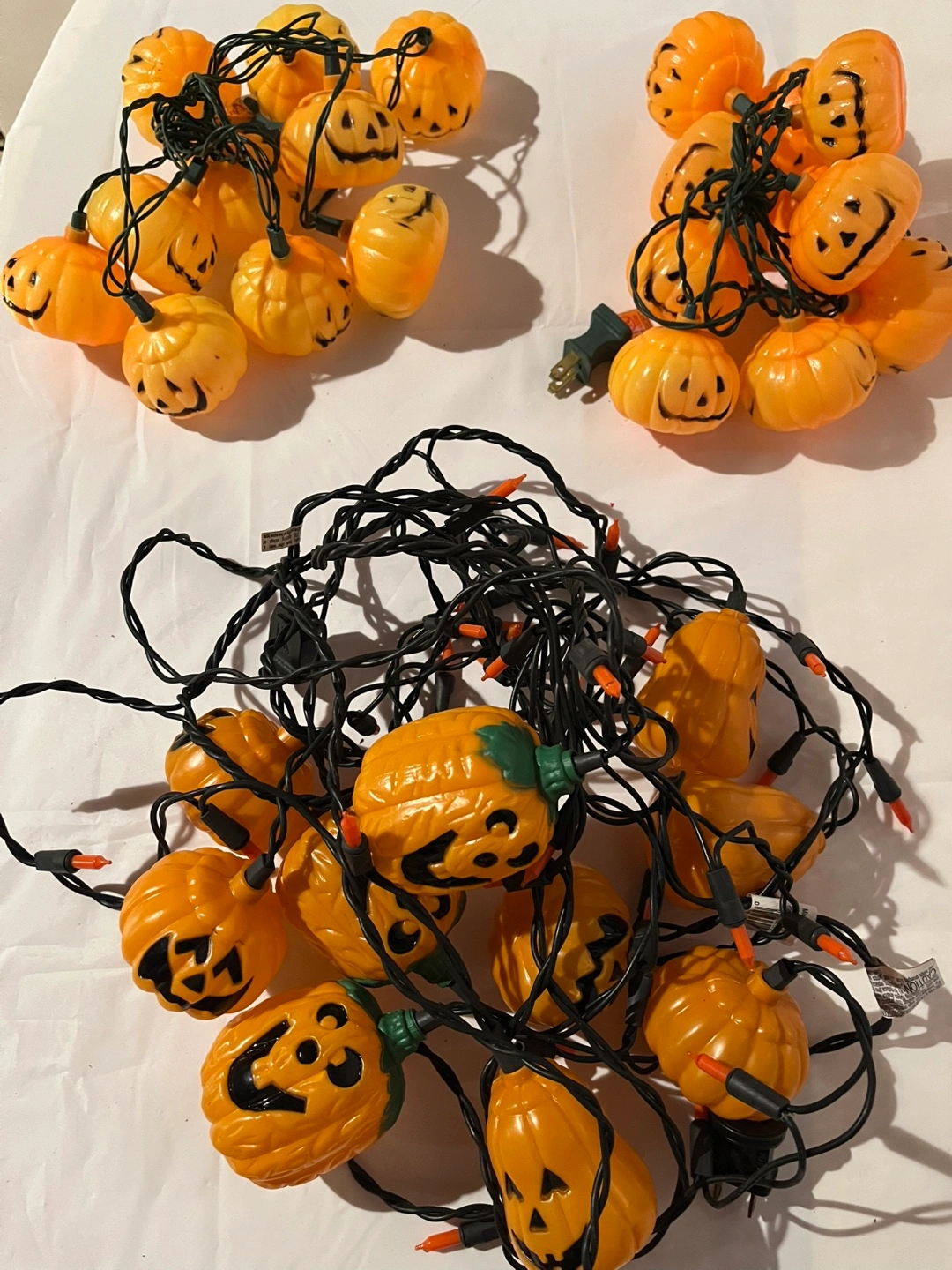 Selling a set of vintage Halloween pumpkin string lights! They're in good condition and ready to add some spooky fun to your Halloween decorations. The lights are pumpkin-shaped and have cute, classic jack-o'-lantern faces. Perfect for indoor or outdoor use during the spooky season.