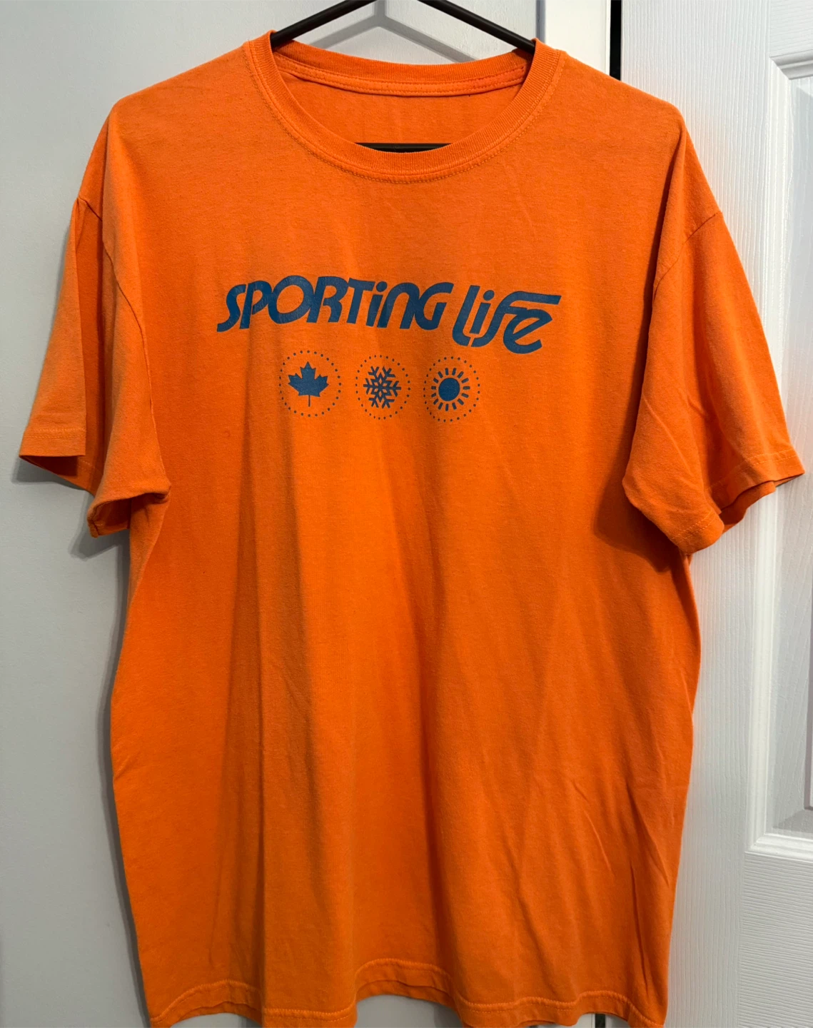 Orange Sporting Life crew t-shirt. The front says "Sporting Life" with a Canadian maple leaf, snowflake and sun design. The back says "CREW".
