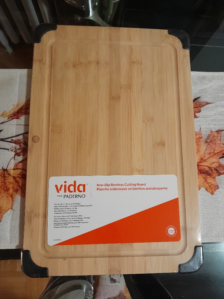 Bought at Canadian Tire for $25 but did not able to use. And im selling it for $20. Vida by Paderno non-slip bamboo cutting board. It's reversible and measures 12 x 18 inches (30.5 x 45.7 cm). Made from durable, eco-friendly bamboo long grain, it resists moisture and scratches. It also features non-slip grips to secure the board and a large juice well to collect liquids