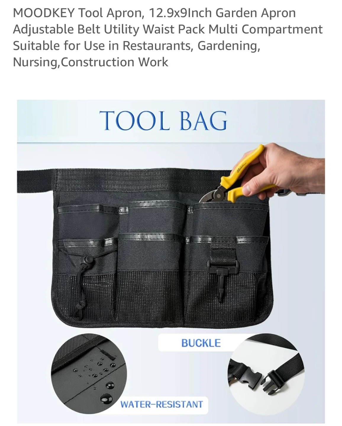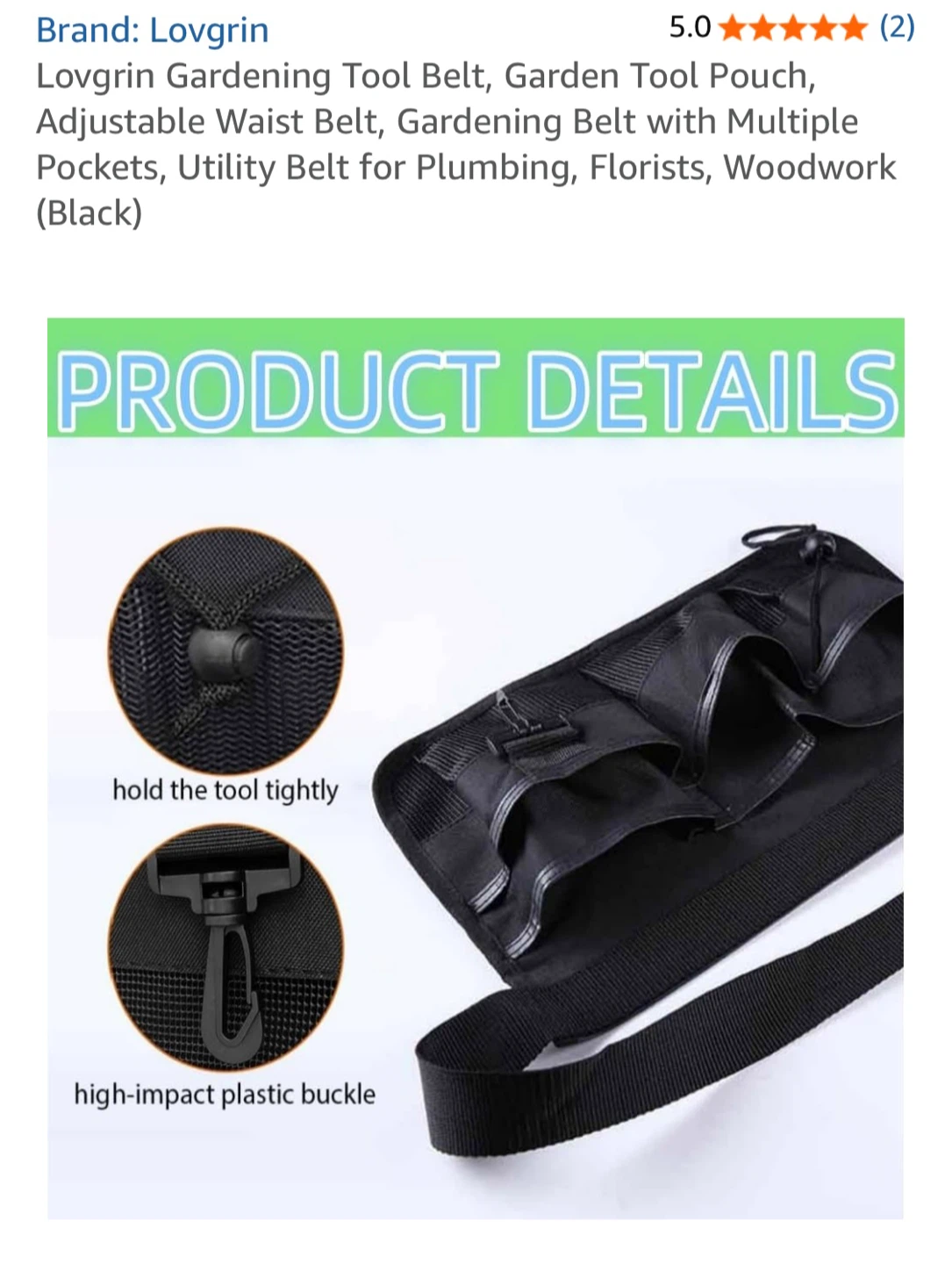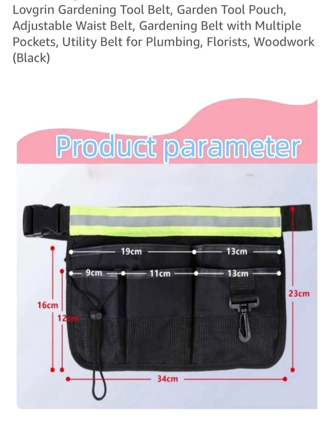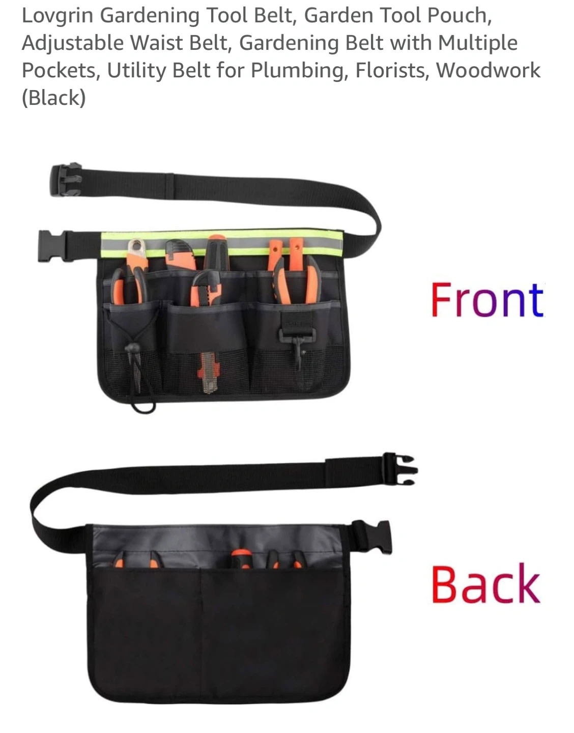 Keep your tools organized with this Lovgrin gardening tool belt! It features multiple pockets and an adjustable waist belt. Perfect for gardening, plumbing, woodwork, and more. The belt is black and made with high-impact plastic buckles to hold tools tightly.