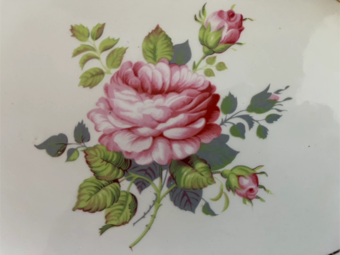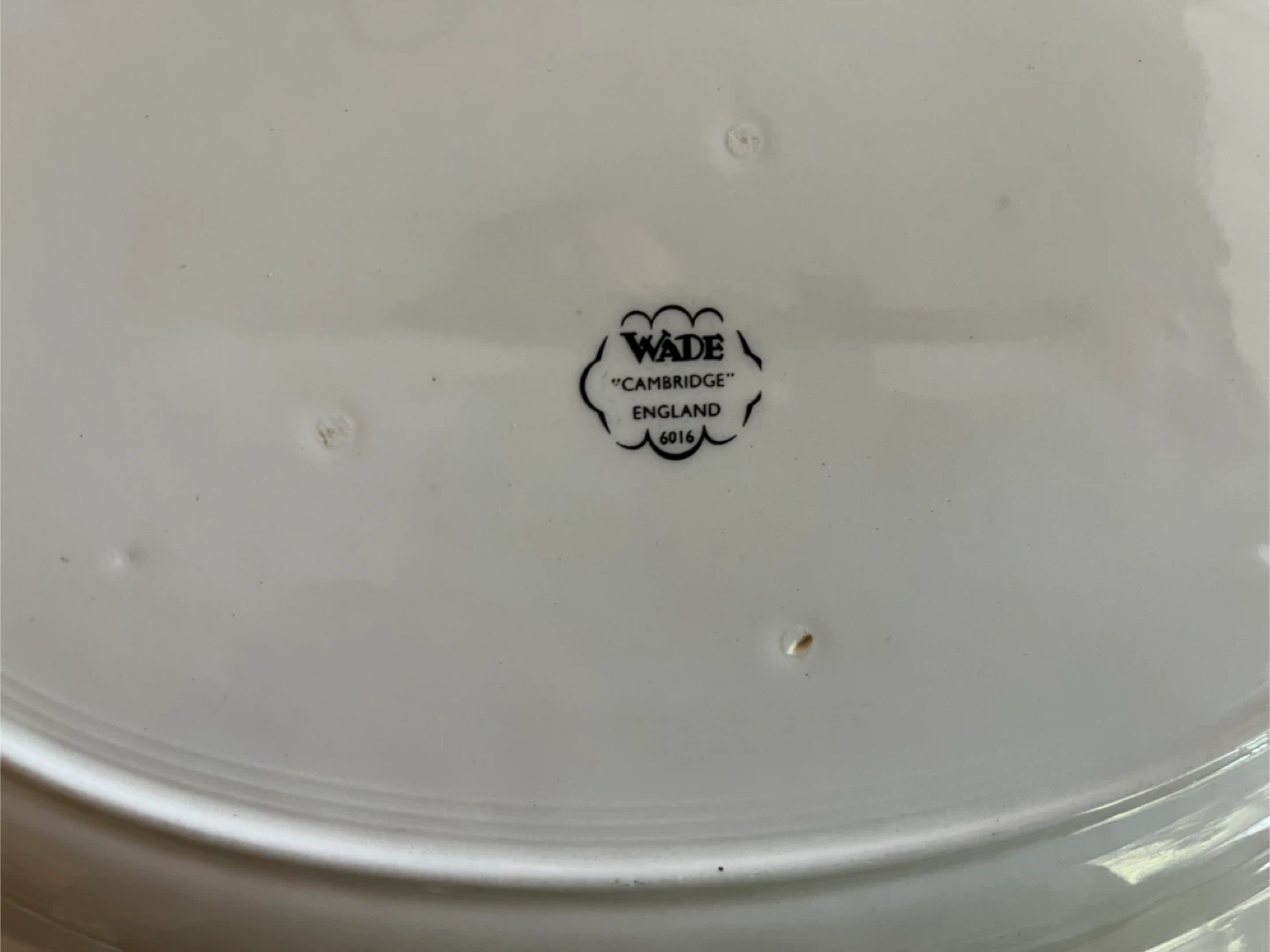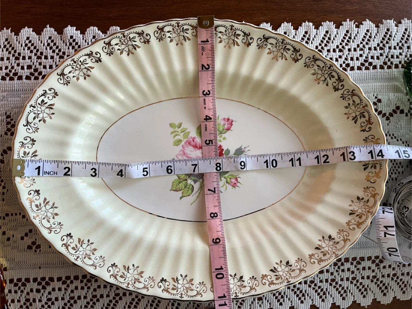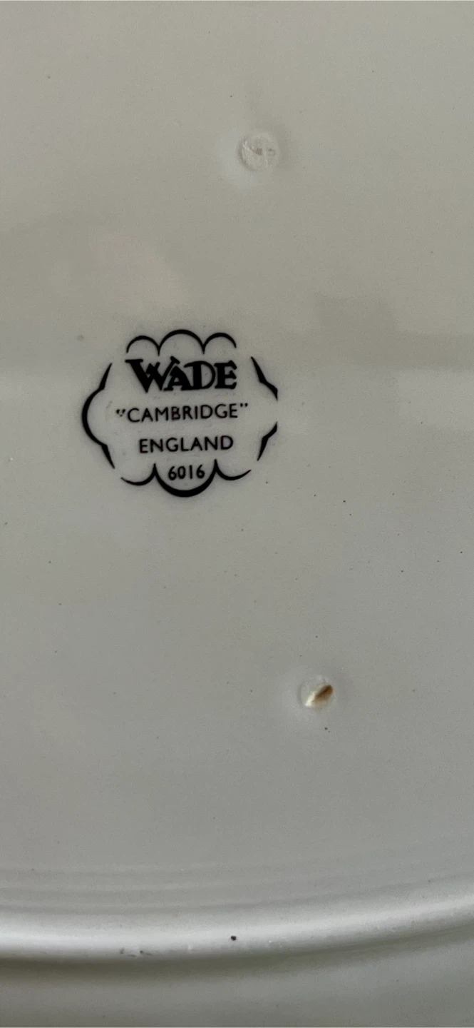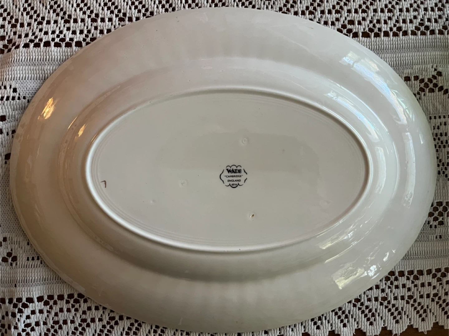 This is a lovely vintage Wade “Cambridge” England 6016 platter, 11x14 inches. It features a beautiful rose design in the centre and a gold floral pattern around the rim. Perfect for serving or display!