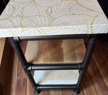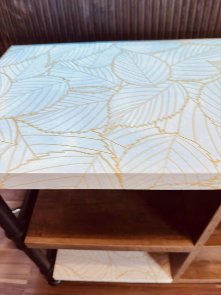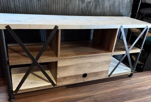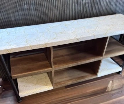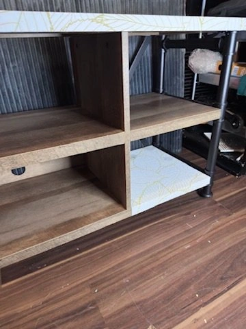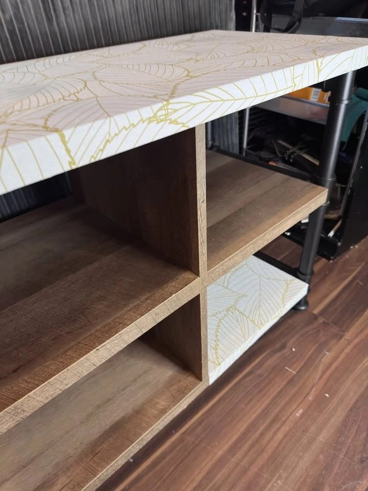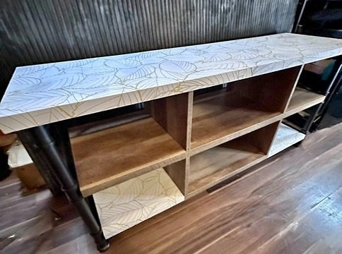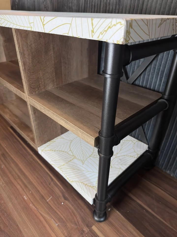 Stylish and functional TV stand with storage. Great for small spaces, condos, or studios. Features a leaf design patterned durable top and bottom shelves with a clean, modern vibe. Solid metal industrial pipe construction makes up the frame. -4 open cubby compartments – perfect for media, books, or baskets -Black metal industrial pipe frame legs for durability -Unique Leaf design patterned finish on top & bottom shelves - Fits flat-screen TVs up to ~50” -Solid and stable -adjustable twist bottom feet to level and stablize