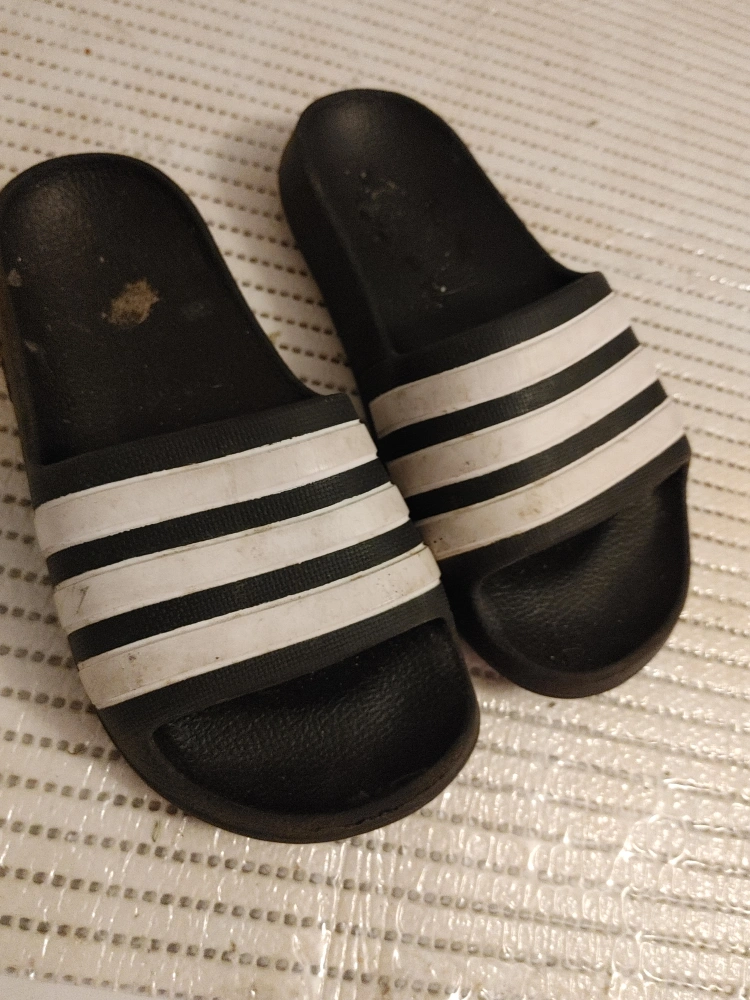 Selling a pair of Adidas Adilette slides in black with white stripes. They are in used condition, but still have lots of life left..