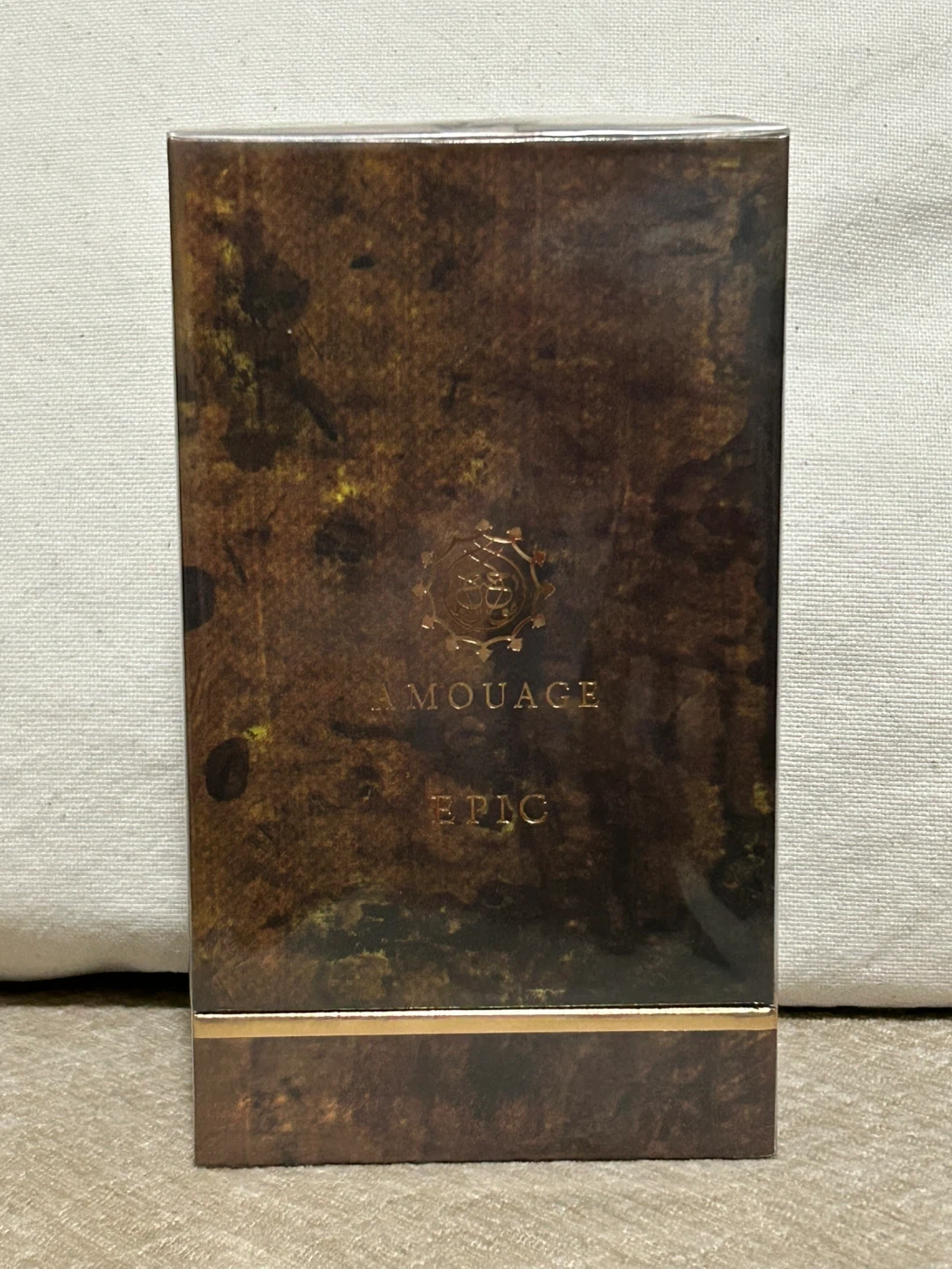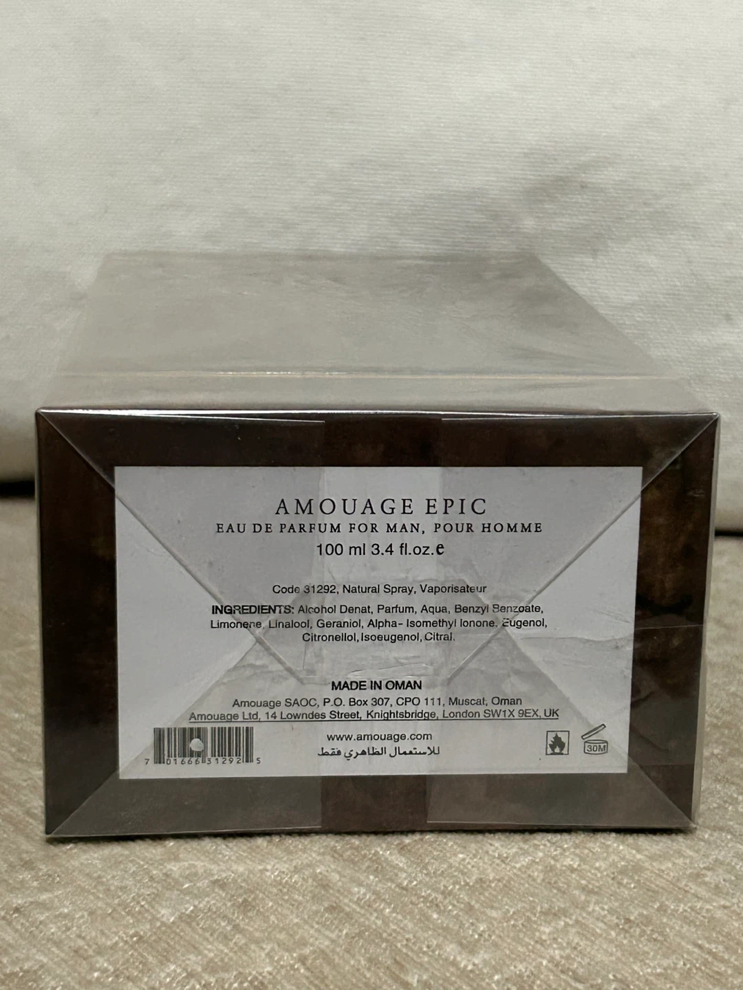 Selling a bottle of Amouage Epic Eau de Parfum for men. It's a 100ml bottle, and it comes in its original box. The scent is a natural spray, and it's still sealed in the packaging!