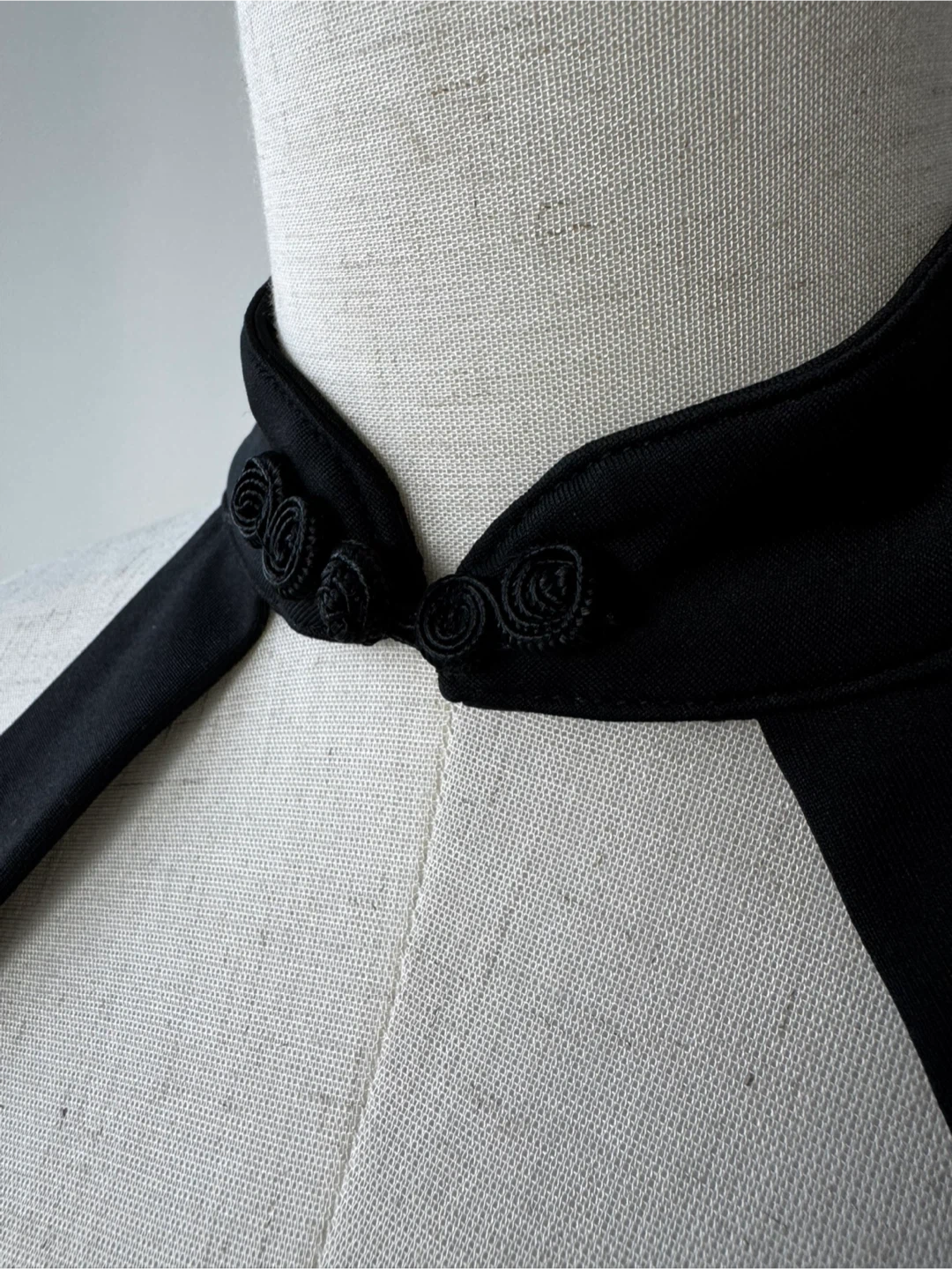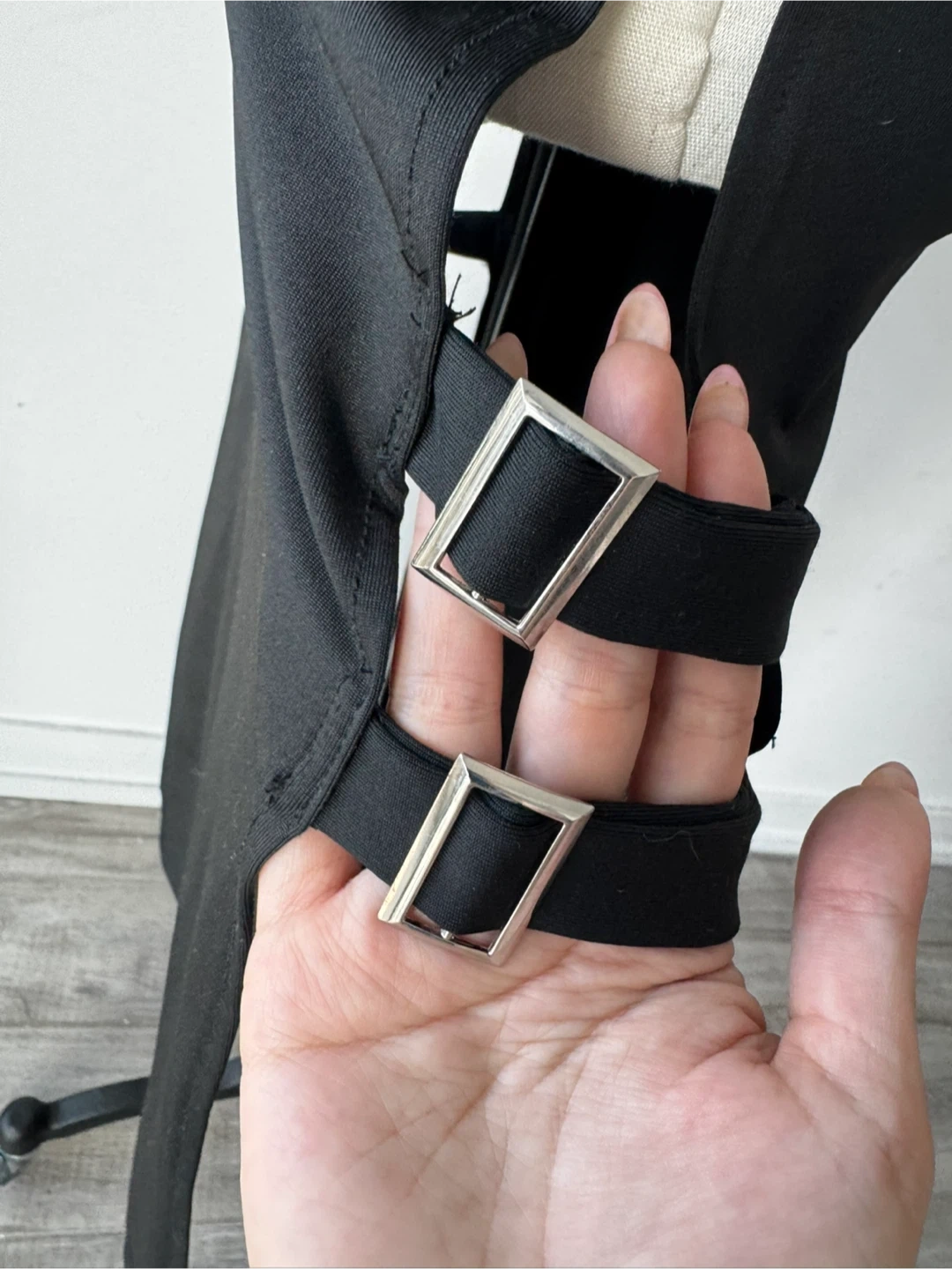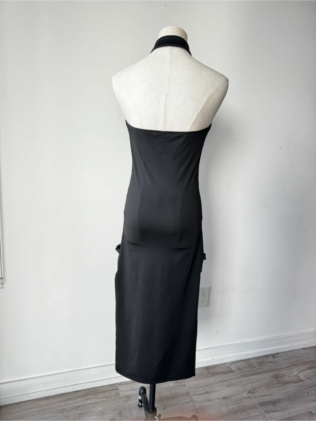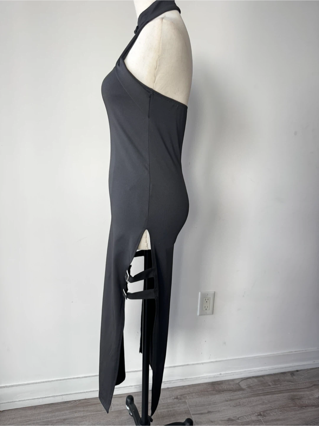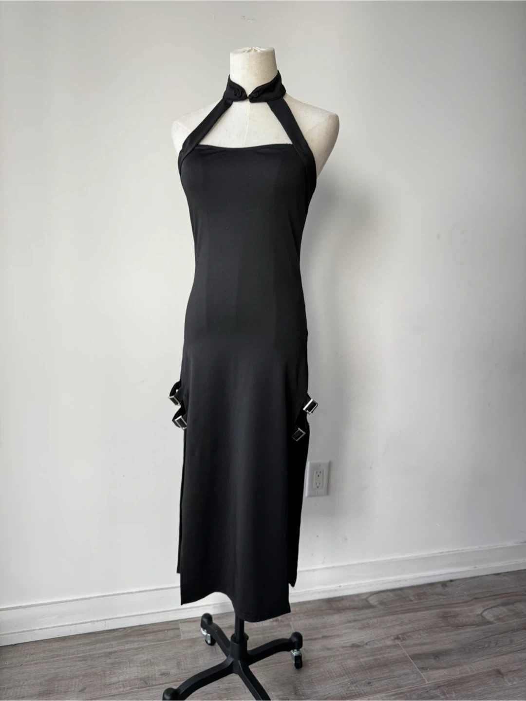 This is a stylish black halter dress featuring a unique buckle detail on the side. The dress has a sleek, modern design with a halter neckline and a side slit. Perfect for a night out or a special occasion!