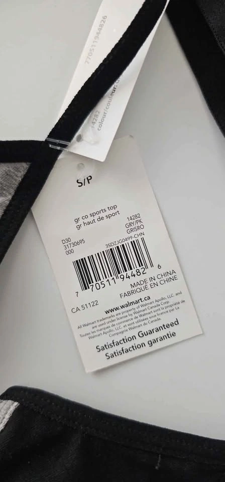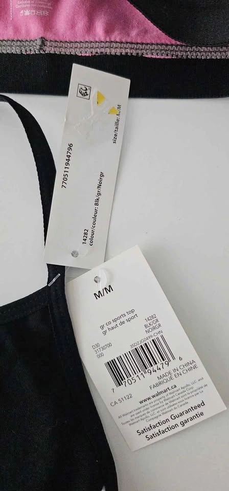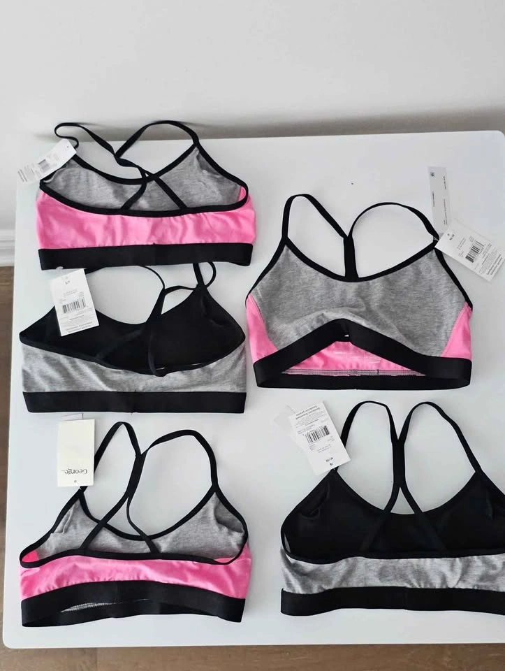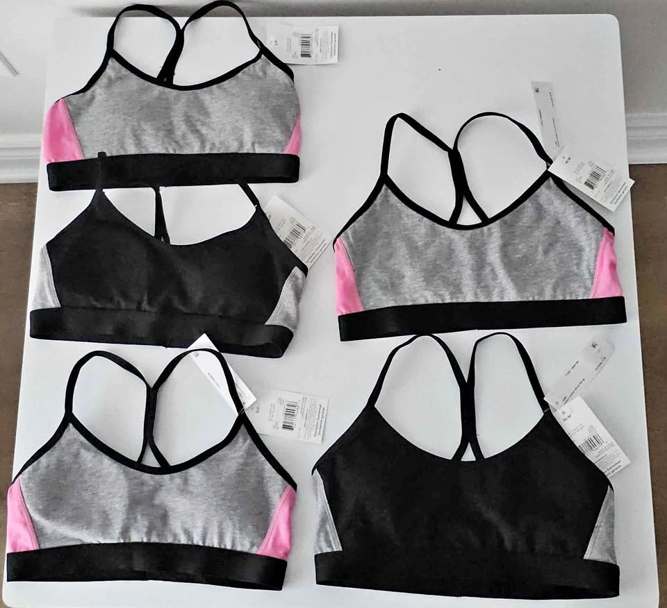 5 girls training/sports bras. The 3 on the left are size S, the 2 on the right are size M. $3 each or $10 for all 5.