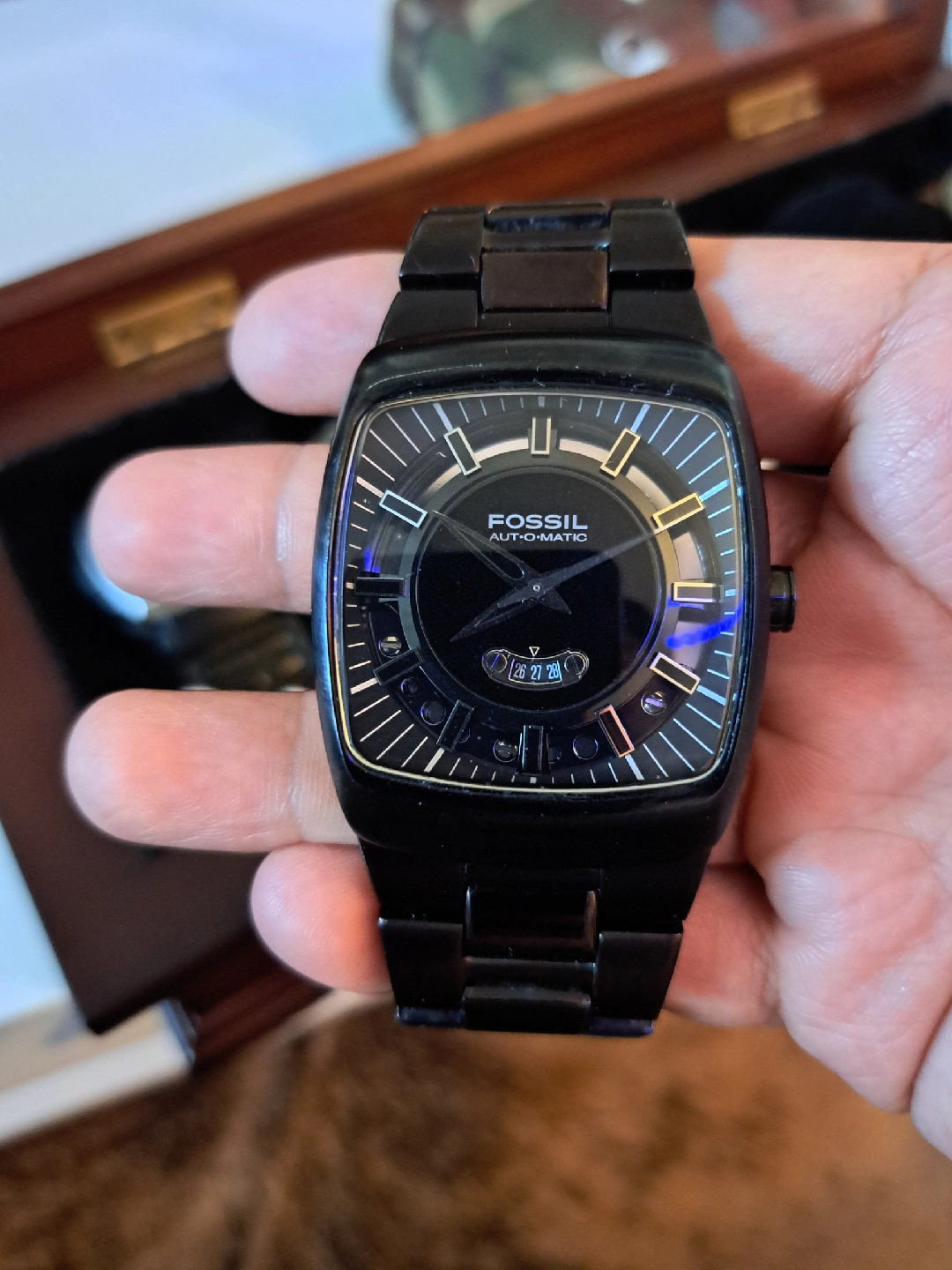 Selling a Fossil Arkitekt automatic watch. It's in great shape and has a sleek, all-black design. The back casing indicates it's made of stainless steel and water-resistant to 50 meters. The model number is FS-4170, and it's part of the Arkitekt series. Watch gives you accurate time.