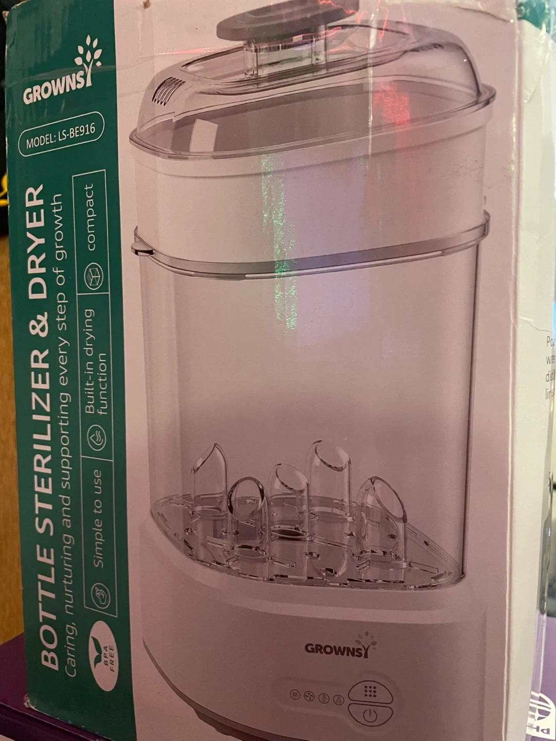 I'm selling a Grownsy bottle sterilizer and dryer. It's the LS-BE916 model. This sterilizer is designed to care for and nurture your baby's growth every step of the way. It's simple to use and compact, with a built-in drying function. It's also BPA free