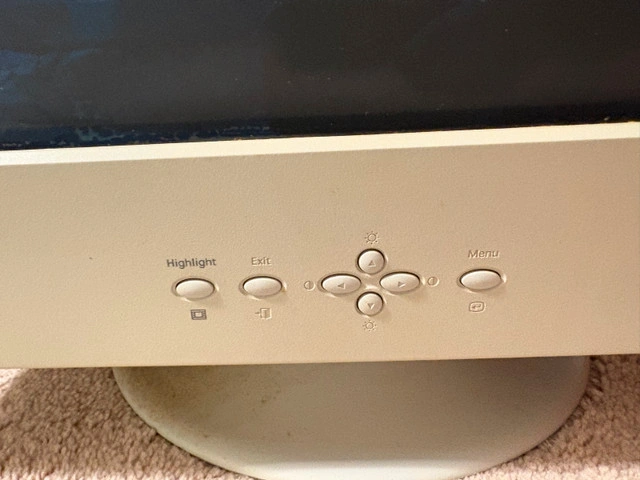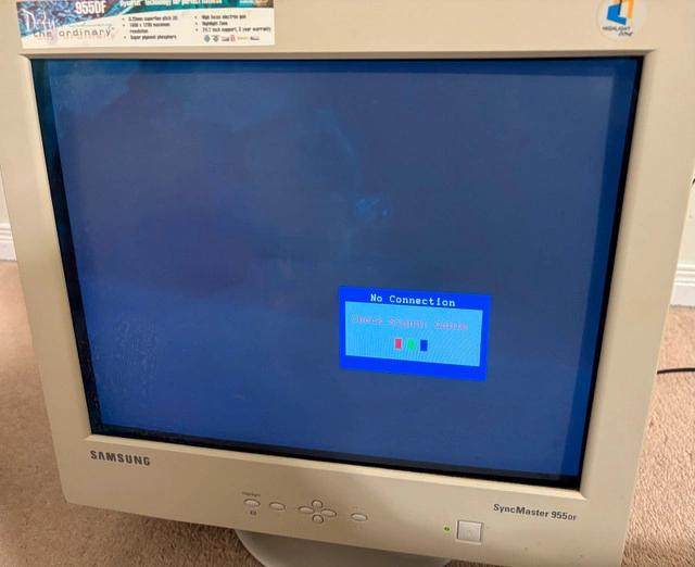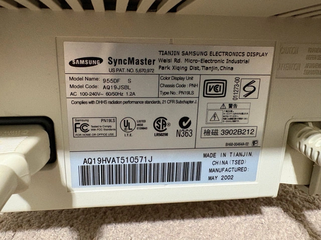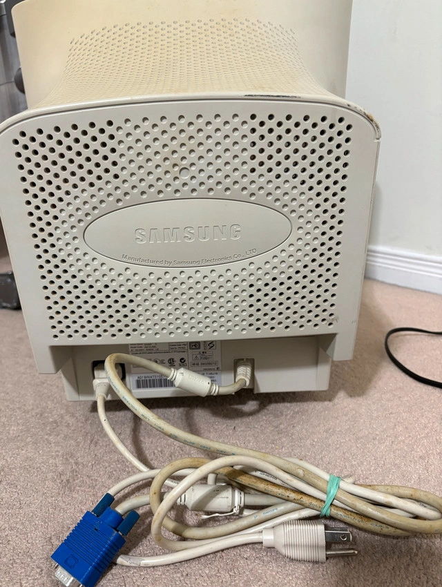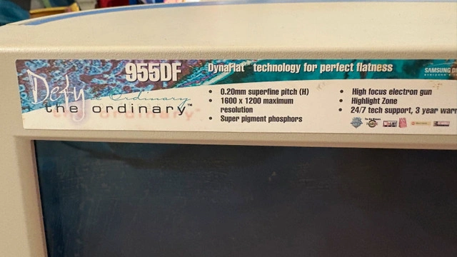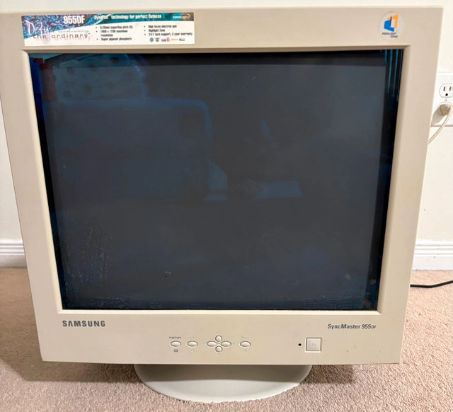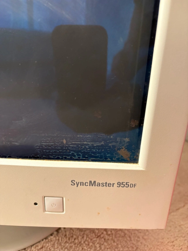 Vintage Gaming Samsung SyncMaster 955DF AQ19JSBL, a 16-inch CRT computer monitor. Features a 200:1 contrast ratio. The model number AQ19JSBL confirms its place in Samsung's esteemed product line. Some damage to screen as seen in photos. Also damage to exterior of monitor. Turns on. Unable to test other features of the monitor so can’t guarantee other features working. For Sale By: Owner