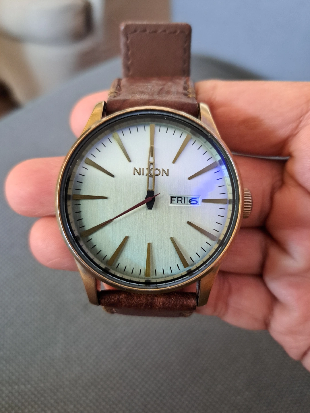 Selling a Nixon The Sentry watch with a brown leather strap. It's in good condition and has a stainless steel case. The watch features a Japan movement and is water resistant up to 100m. It's a stylish and reliable timepiece!