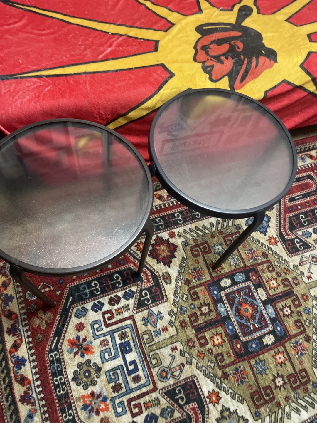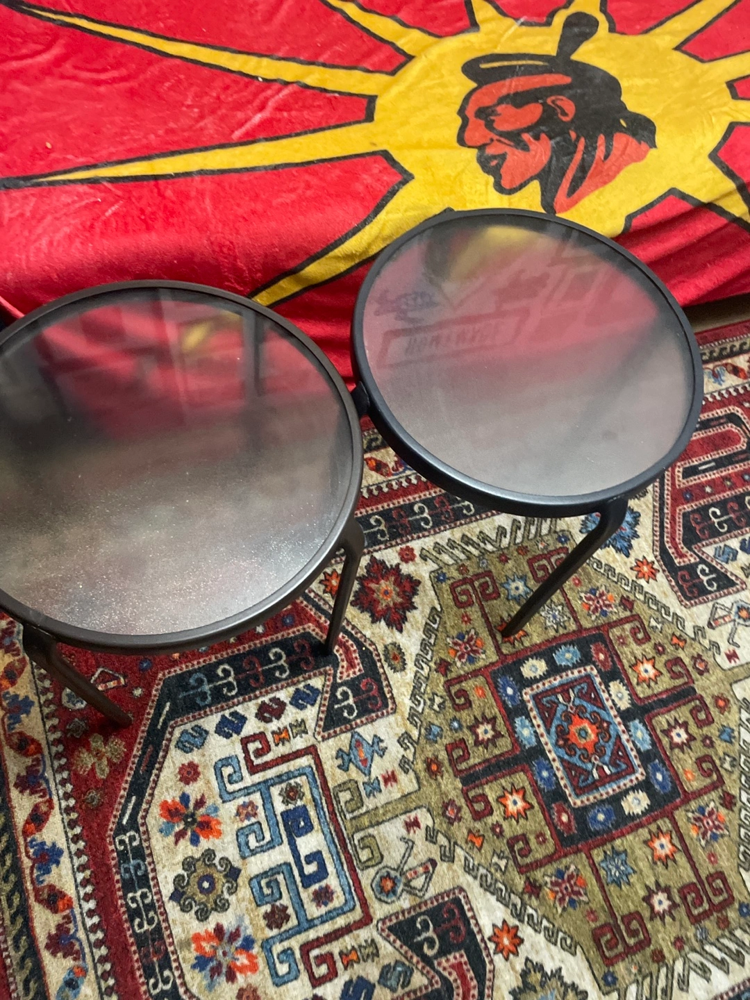 Selling a set of two round side tables. They have a sleek, modern look with glass tops and dark metal frames. Perfect for adding a touch of style to your living space or bedroom