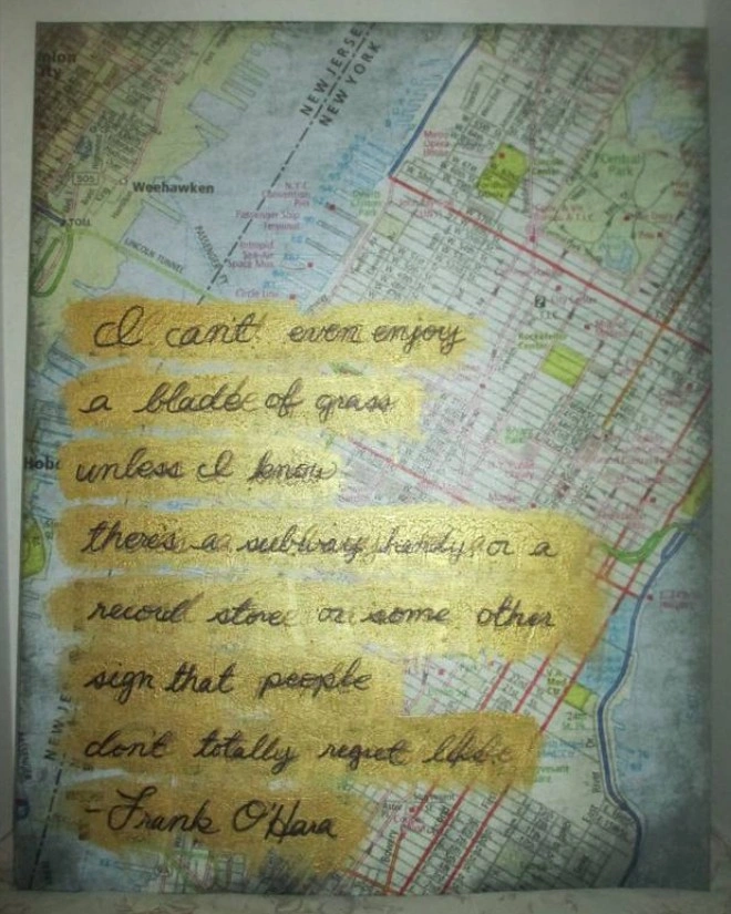 Wall art featuring a map of New York and New Jersey with a poem by Frank O'Hara painted over it in gold. It's a unique piece to add some character to your space! measures approx. 30" x 30"