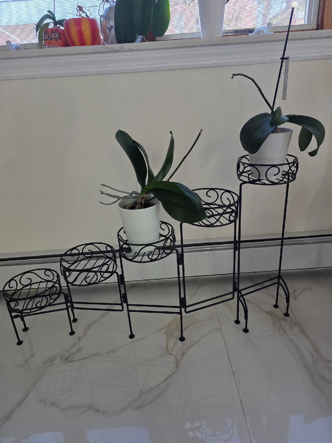 Selling a black metal plant stand with multiple tiers. It's perfect for displaying your favorite plants and adding a touch of elegance to your home. The stand is in great condition and ready for a new home