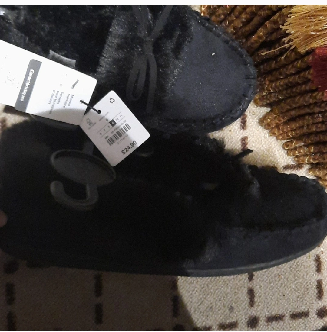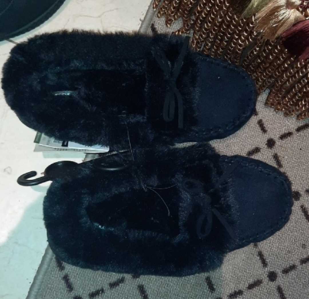 Cozy black moccasin slippers, perfect for keeping your feet warm! These are a size 9 and feature a soft, plush lining. Originally bought for $24.90, these slippers are in excellent condition and ready for a new home