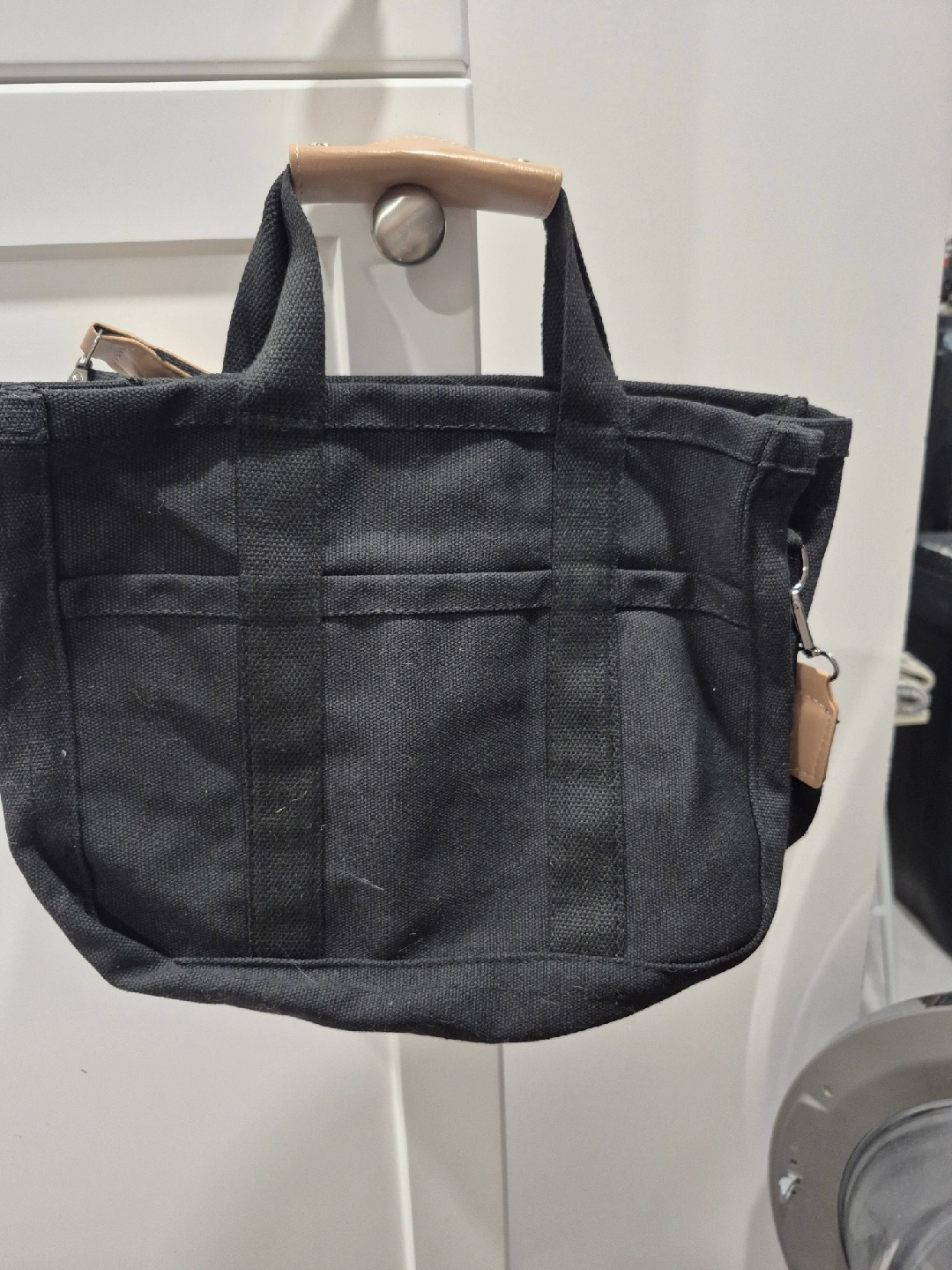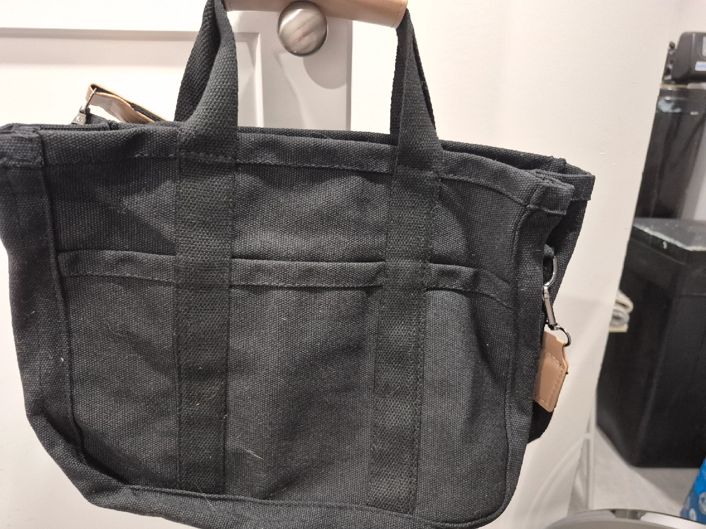 A simple and stylish black tote bag! It's in great condition and ready for a new home. Perfect for everyday use, carrying groceries, or as a book bag. Has a number of pockets on the outside for easy access to your essentials