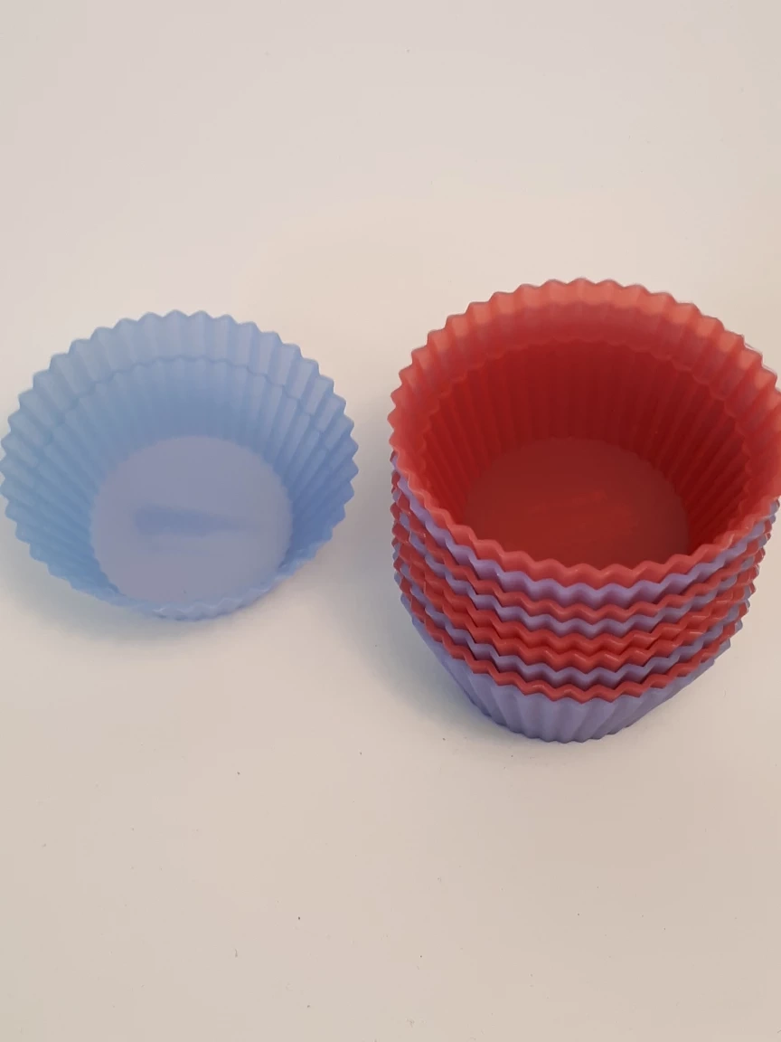 I'm selling a set of 12 Wilton silicone baking cups. These are great for making muffins, cupcakes, or other treats. Takes little space to store. The set includes 6 purple and 6 pink baking cups. They are easy to clean and reusable. There is a ridge inside for even filling. Great size for 15 minutes baking time breakfasts. Bottom diameter is 4.5 cm. Top diameter is 7 cm. Each cup is 3.5 cm high. My kids grown and I am not packing school lunches anymore, hence, I don't have much use for them.