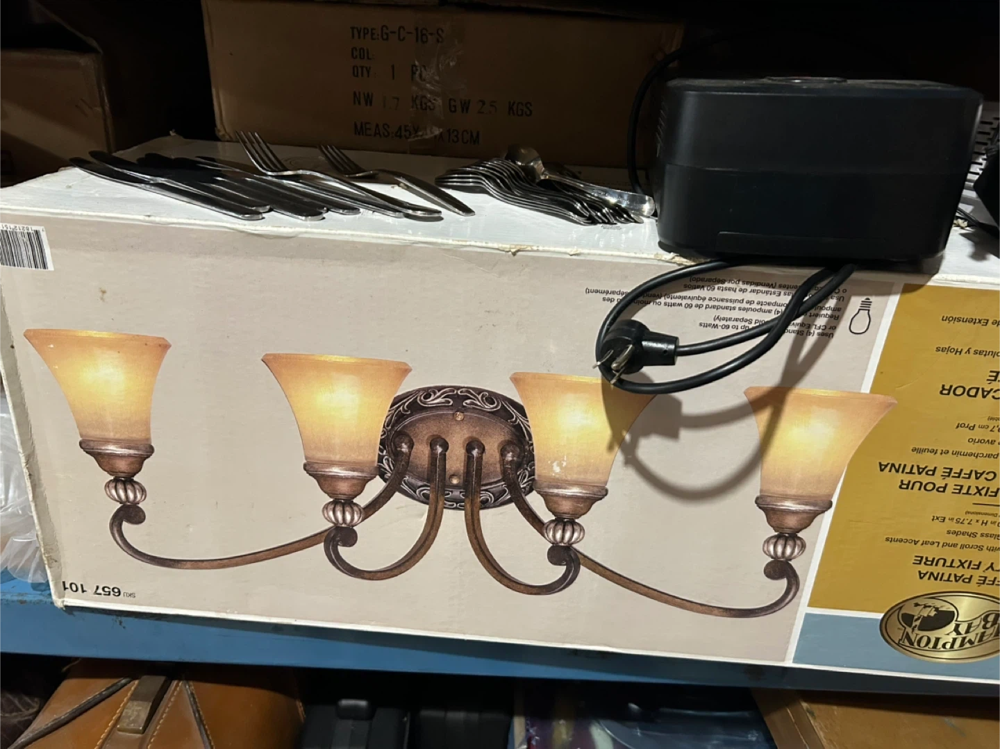 Selling a Hampton Bay Caffe Patina vanity fixture with scroll and leaf accents! It uses standard 60-watt bulbs or CFL equivalent. The glass shades give off a warm, inviting glow. Perfect for adding a touch of elegance to your bathroom!