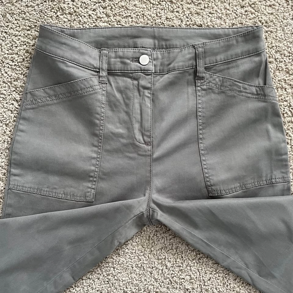 - Colour is a muted, washed olive green - Cropped, ankle pant