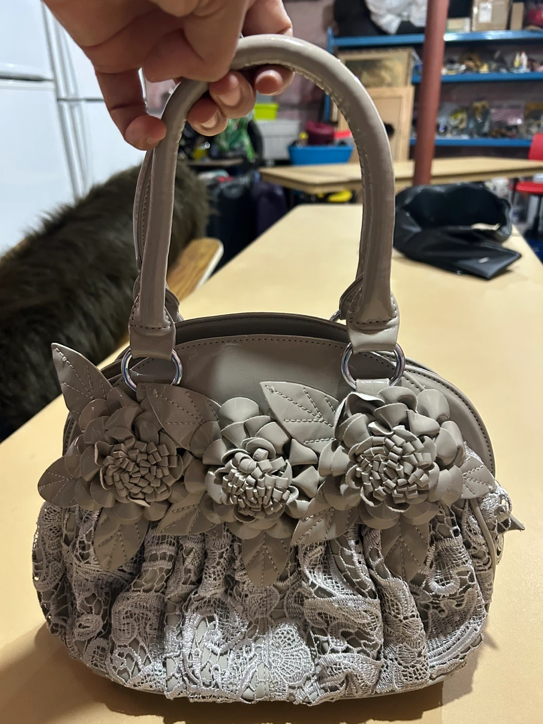 This is a beautiful handbag with a unique floral and lace design. It's in great condition and perfect for adding a touch of elegance to any outfit. The colour is a lovely neutral grey, making it versatile for different occasions