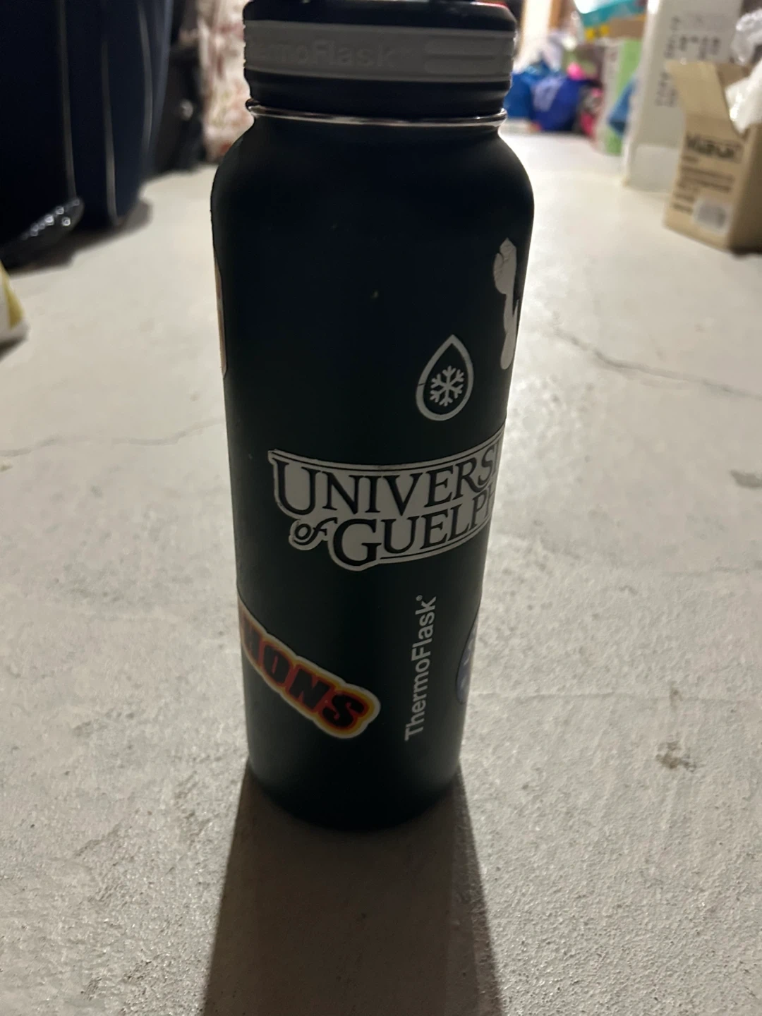 ThermoFlask water bottle with University of Guelph stickers. Perfect for staying hydrated on the go!