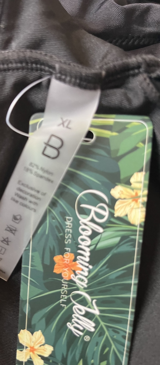 This is a Blooming Jelly black bikini in size XL. It's made of 82% nylon and 18% spandex. Perfect for vacations.