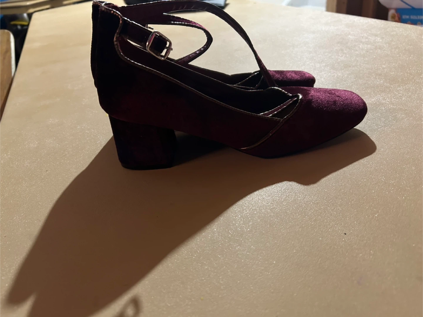 These are a cute pair of burgundy velvet Mary Jane heels in size 7. They have a block heel and a strap that buckles around the ankle. Perfect for adding a touch of vintage charm to any outfit!