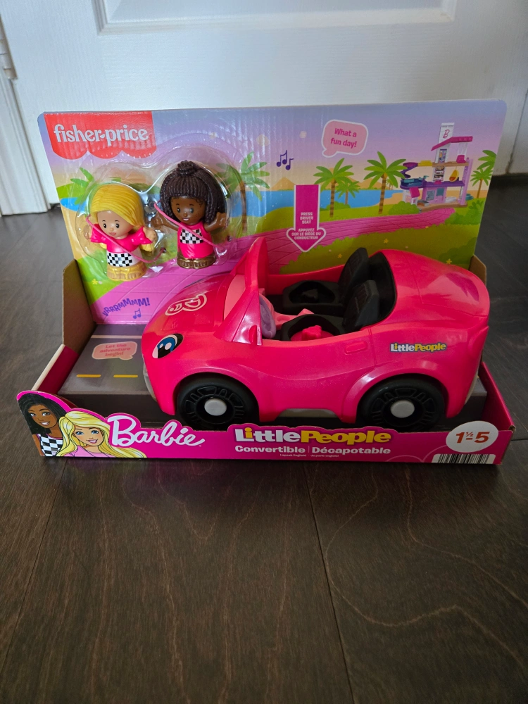 Includes two Little People figures for fun adventures. Perfect for little ones who love Barbie and cars. Brand new in box