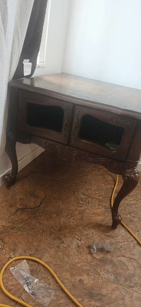 66Selling a vintage-style sideboard cabinet. It's a lovely brown colour with ornate carved legs and detailing. The front features two doors with mesh inserts. It would be a great addition to any living room or dining room!