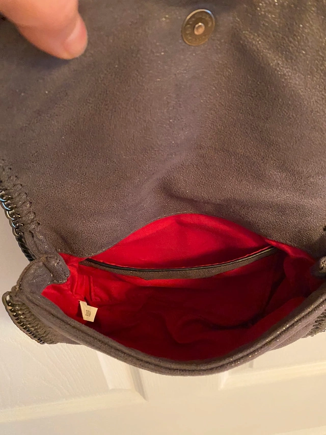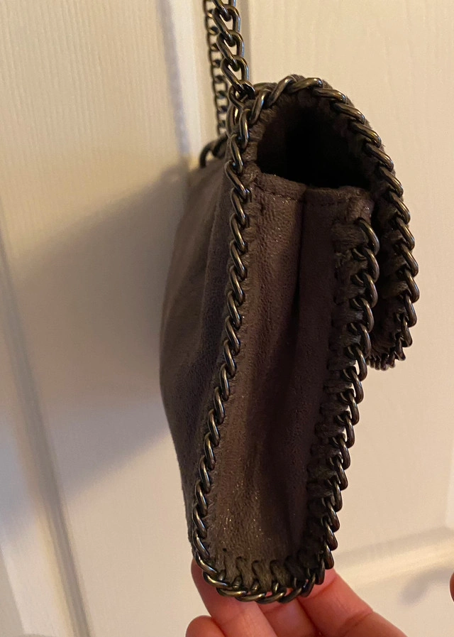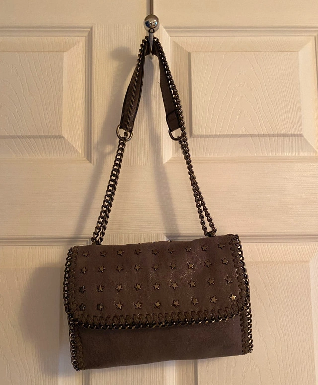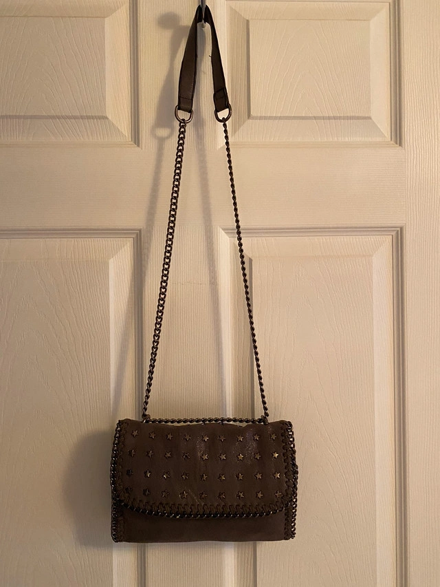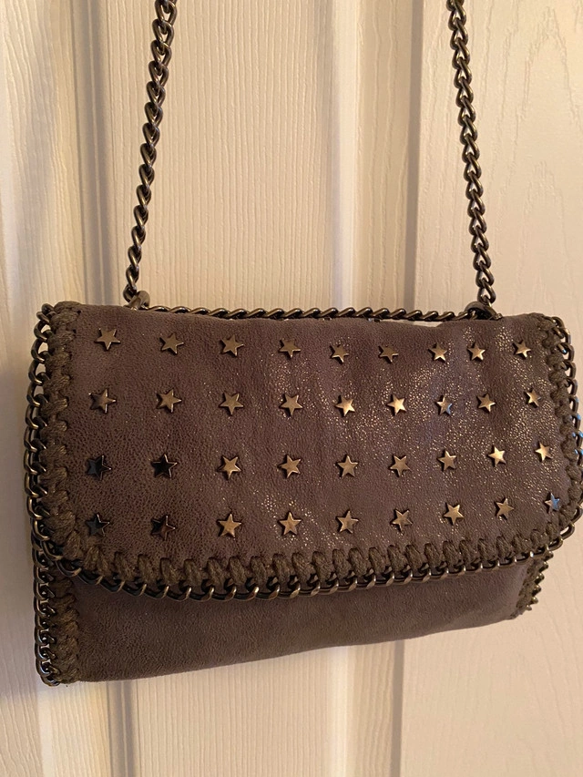 Grey shimmery suede fabric. Chain edging and star studded flap. Adjustable strap. 1 interior slip pocket. 8” wide x 6” high x 2” deep. Cash only. Pick up College or Wellesley. From a pet-free, smoke-free home.