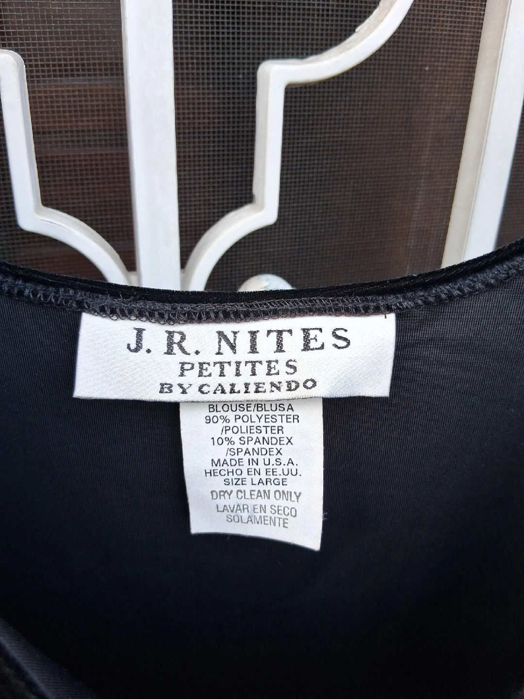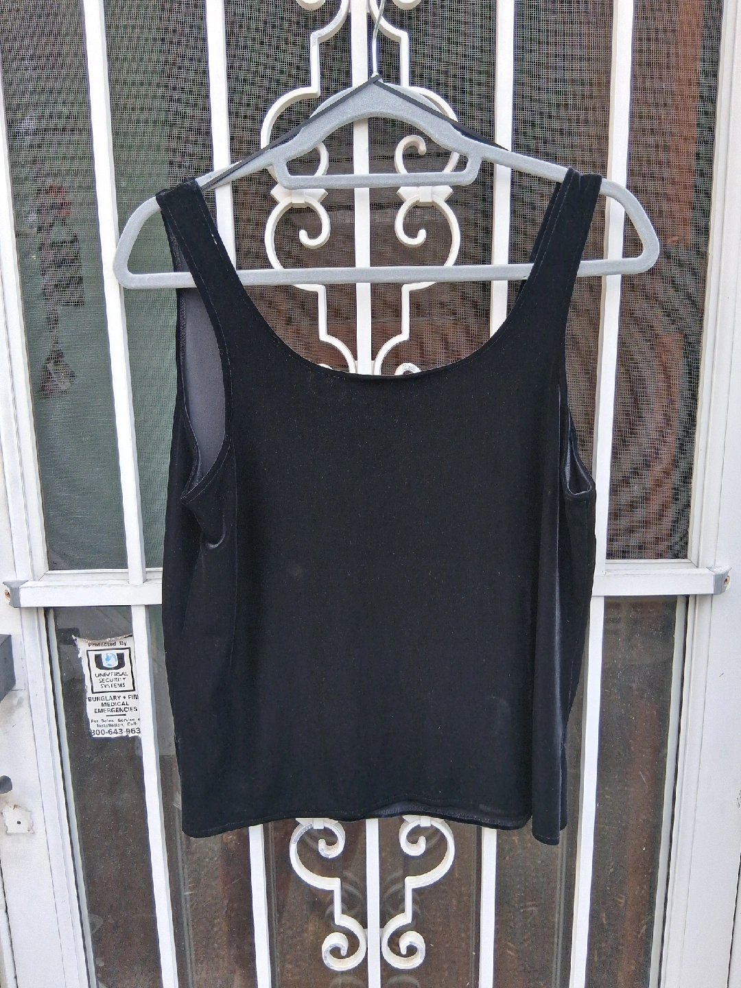Selling a J.R. Nites Petites black velvet tank top. It's a size large and made of 90% polyester and 10% spandex. It's in great condition and ready for a new home!