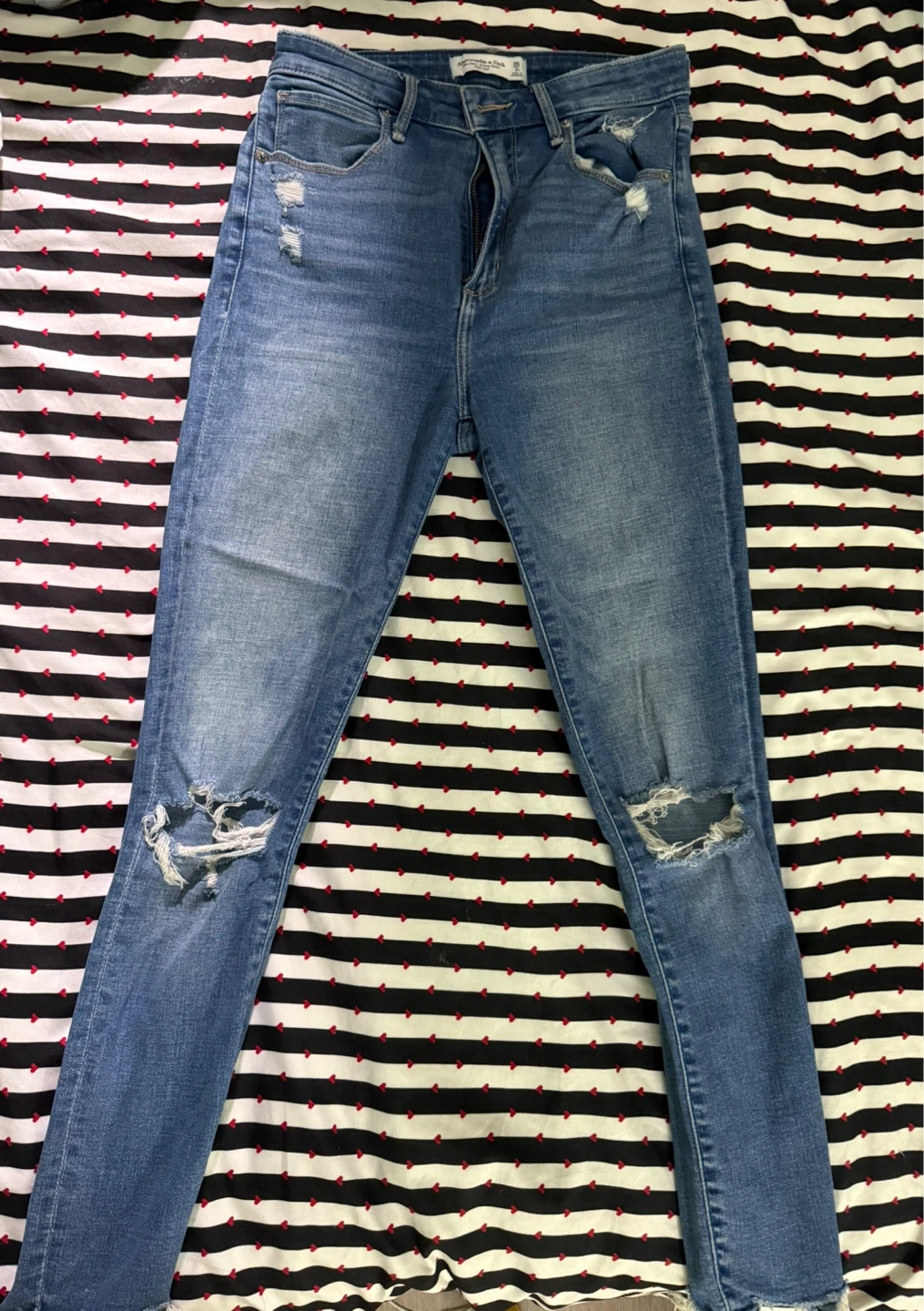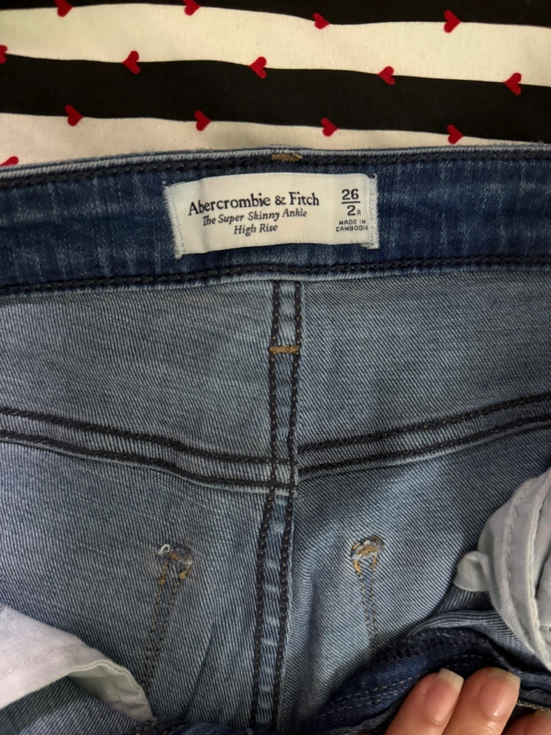 Selling a pair of Abercrombie & Fitch The Super Skinny Ankle High Rise jeans in size 26. They're in great condition and ready for a new home! These jeans have a stylish, distressed look with rips, perfect for a casual and trendy outfit