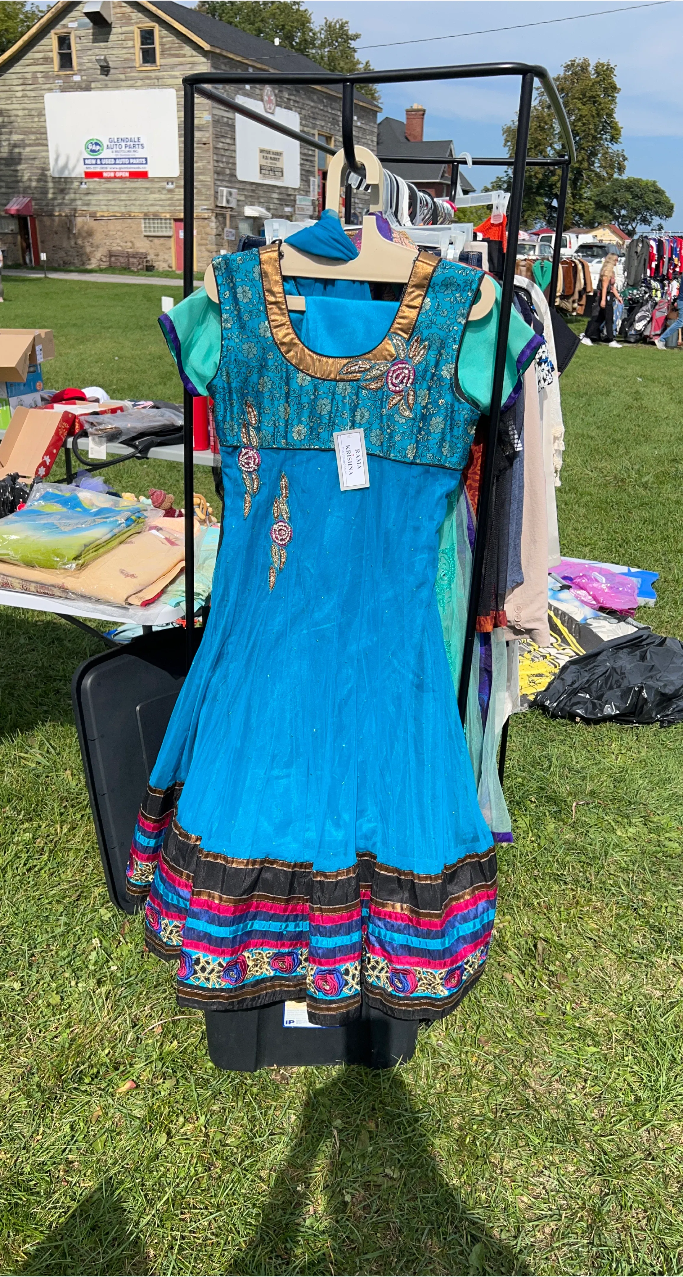 Beautiful turquoise Rama Krishna dress! It features lovely embroidery and a unique design, perfect for a special occasion or adding a pop of colour to your wardrobe