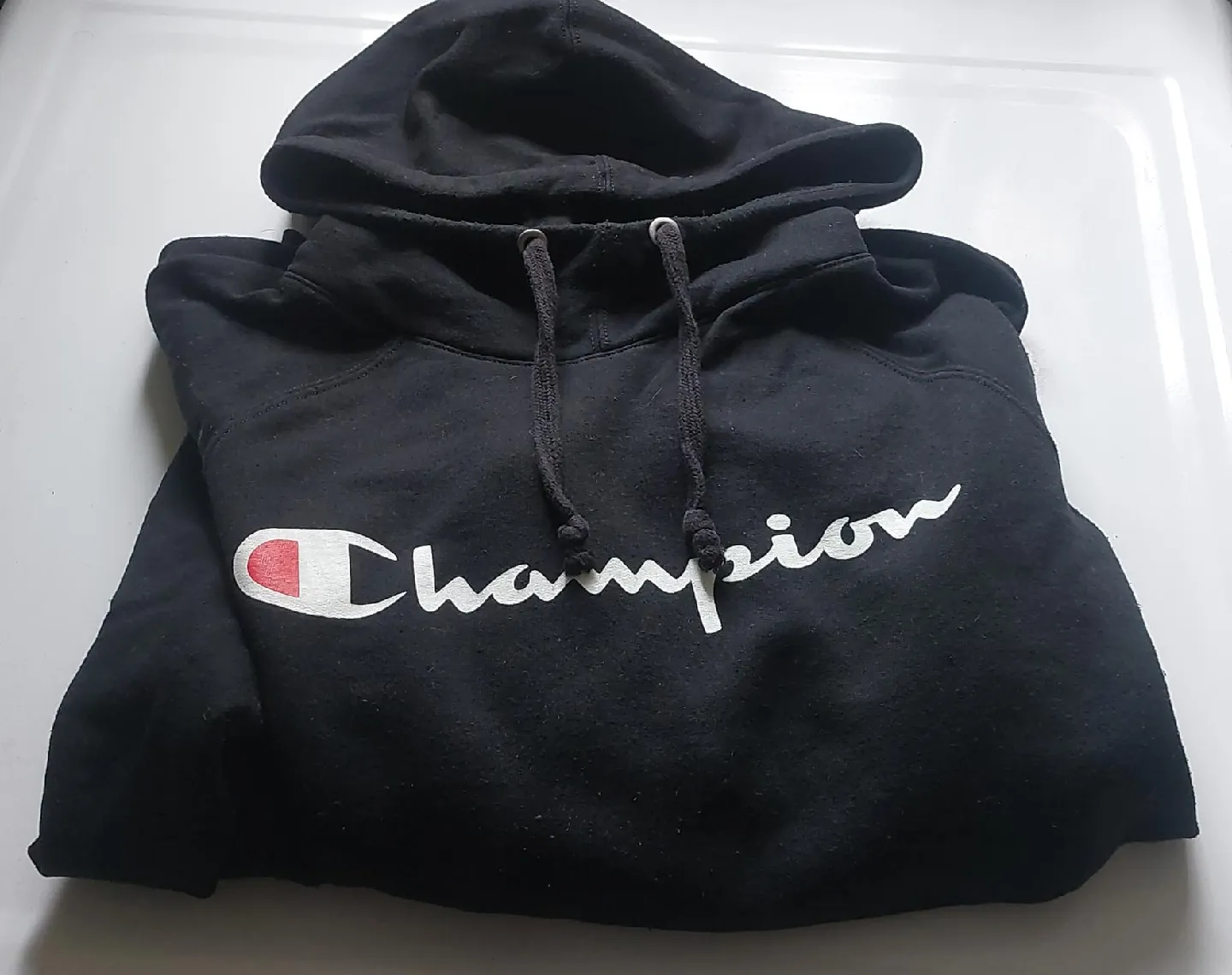 Selling a black Champion hoodie! It's in great condition and ready for a new home. The iconic Champion logo is displayed on the front. Perfect for staying cozy on cooler days!